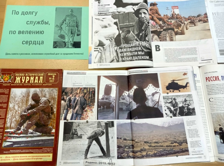 С 11 по 25 февраля в зале периодики Орловской областной библиотеки им. И. А. Бунина работает выставка «По долгу службы, по велению сердца», посвященная Дню памяти о россиянах, исполнявших служебный долг за пределами Отечества, который отмечается ежегодно15 февраля. Эта дата, начиная с 1989 года, широко отмечается как День вывода советских войск из Афганистана.
