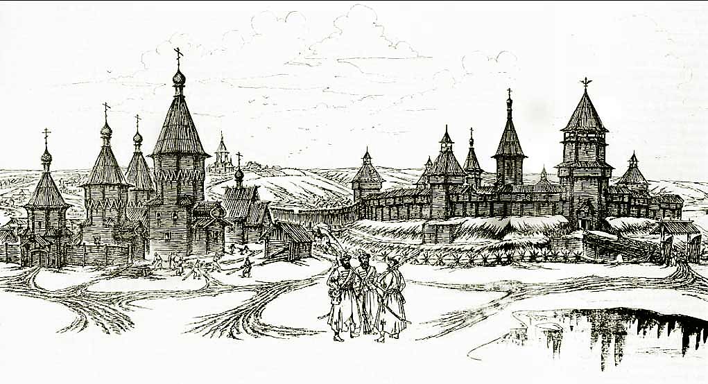 В левой части рисунка - Богоявленский монастырь с двумя церквами - шатровой Богоявления Господня и клетской Козьмы и Дамиана. Реконструкция В.М. Неделина После разорения Орла поляками и литовцами в 1606 году, происходит восстановление и укрепление Орловского острога. Одновременно с этим в 1641 году была построена деревянная Богоявленская соборная церковь. Вскоре рядом возведена церковь во имя святых князей Бориса и Глеба. И вокруг двух храмов образован мужской Богоявленский монастырь. После пожара 1680 года он был перенесен вниз по Оке на Ввозную гору, затем переименован в Успенский. Сама же Богоявленская церковь, хоть и не ясно, сгорела она тогда, или же сильно пострадала, обращена в приходскую.