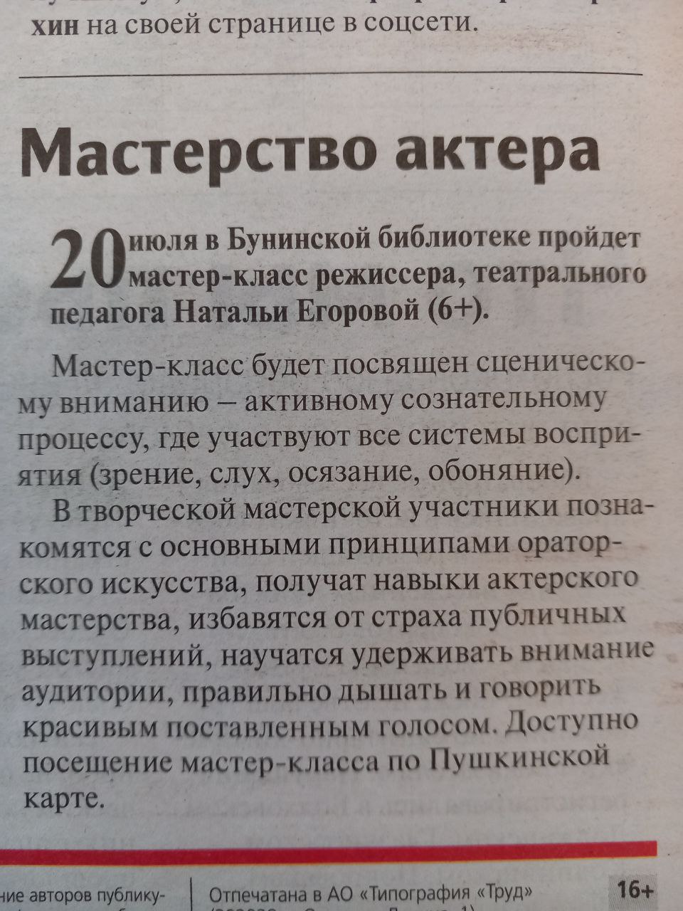 Мастерство актера// Орловская городская газета. – 2023. - № 27 (14 июля). – С. 16 |