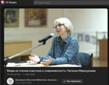 Меркурьева Н. Мода на чтение классика и современность : [видеоинтервью] / Н. Меркурьева, беседовала Н. Ставцева // Орловская областная библиотека «Бунинка»: офиц. группа ВКонтакте : [страница группы рос. соц. сети ВКонтакте]. 31 июля. 2022. 00:30:49 (время воспроизведения). URL: https://vk.com/video/playlist/-215540055_5?z=video-215540055_456239033%2Fclub215540055%2Fpl_-215540055_5 (дата обращения 26.06.2024). | |