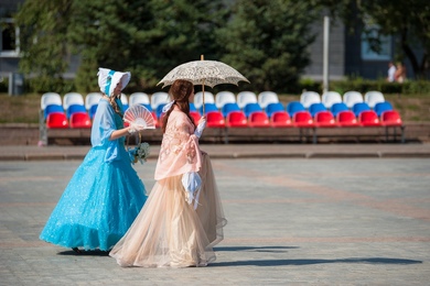 Сотрудницы библиотеки в костюмах тургеневских