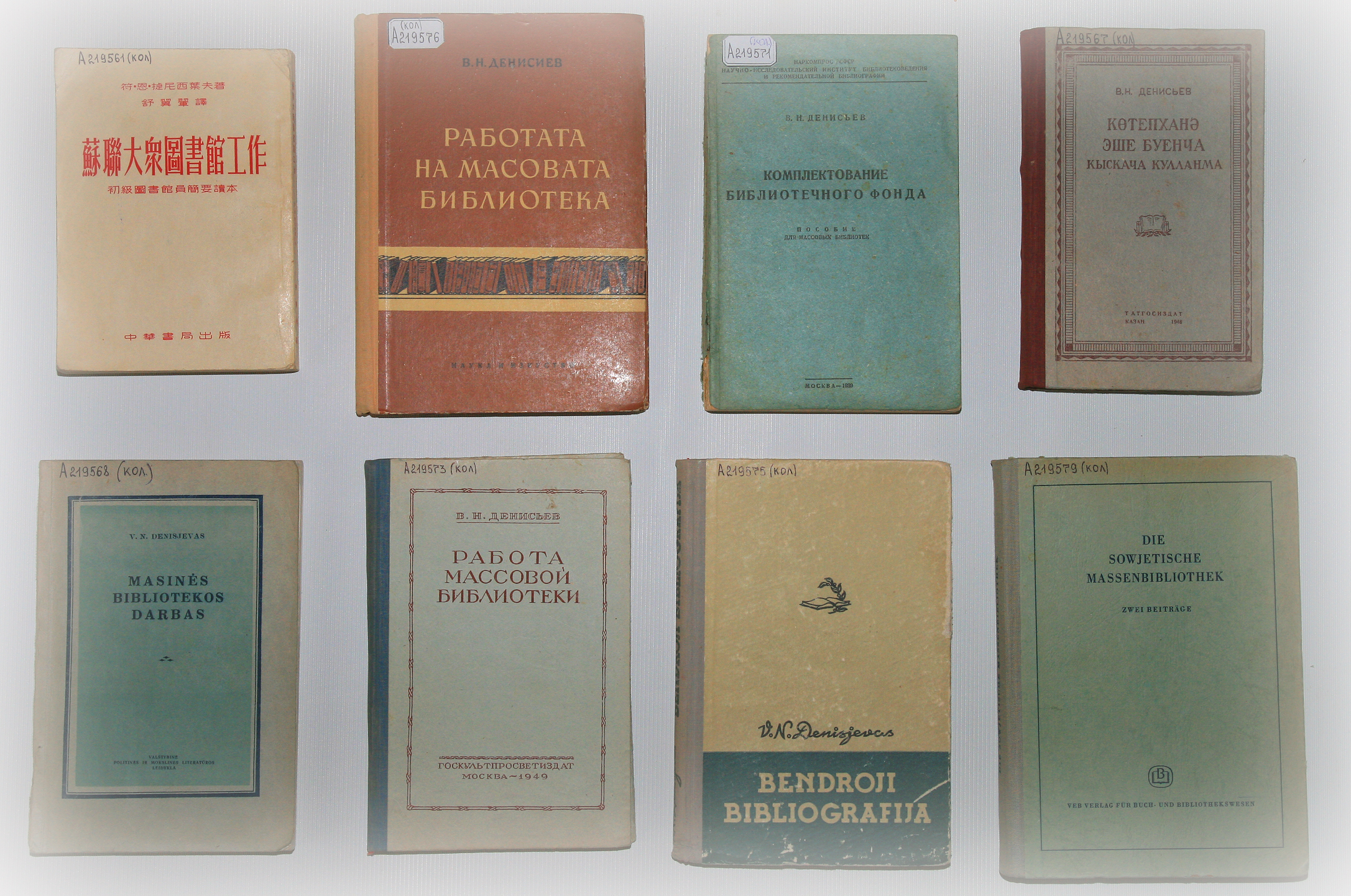 Всего В. Н. Денисьевым написано более 130 книг, брошюр, статей многие из которых переведены на иностранные языки (немецкий, литовский, болгарский, татарский и китайский). Коллекция В.Н. Денисьева насчитывает 22 книги, в том числе: «Работа массовой библиотеки» на китайском (1952 г.), литовском (1951 г.) и болгарском (1955 г.) языках, «Общая библиография» (1956 г.) на литовском языке, «Краткое руководство по библиотечному делу» (1948 г.) на татарском языке, «Советские массовые библиотеки» (1954 г.) на немецком языке, «Библиотековедение», «Работа с газетой в библиотеке» и другие.