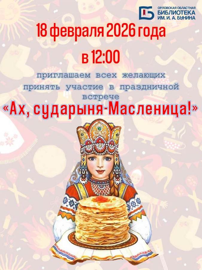 18 февраля в 12:00 в Орловской областной научной универсальной публичной библиотеке имени И. А. Бунина, в рамках проекта «Семья: праздники и традиции», состоится праздничная встреча «Ах, сударыня Масленица!».