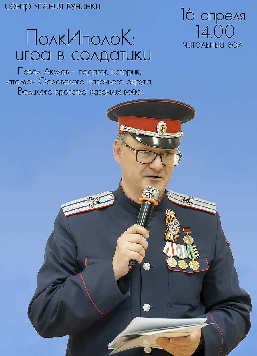 16 апреля в 14:00 в большом зале Орловской областной библиотеки им. И. А. Бунина состоится очередная встреча в рамках культурно-просветительского проекта «ПолкИполоК». Мы несколько переформатировали концепцию проекта, теперь основой наших встреч стала тематика, связанная с военной литературой, «мускулинными» увлечениями, коллекционированием соответствующей атрибутики, изучением персоналий русской военной истории. В центре, конечно, остаётся книга, формирующая мировоззрение человека Отечества.