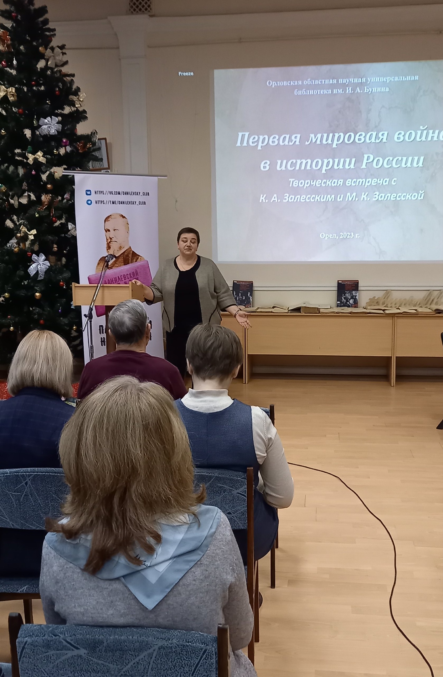 8 декабря 2023 года в библиотеке состоялась встреча с известным историком Первой и Второй мировых войн Константином Александровичем Залесским и главным редактором издательства «Молодая гвардия», писательницей-биографом Марией Кирилловной Залесской (г. Москва). Мероприятие являлось совместным проектом библиотеки, Данилевского клуба и Молодежного братства во имя св. Георгия Победоносца и проходило в рамках празднования Дня Героев Отечества.