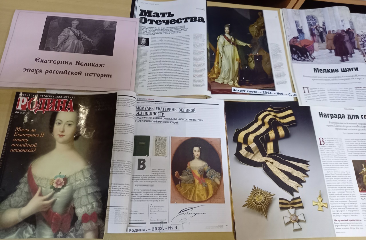 23 апреля 2024 года в зале периодики состоялся обзор выставки «Екатерина Великая: эпоха российской истории», посвященной 295-летию со дня рождения российской императрицы Екатерины II.