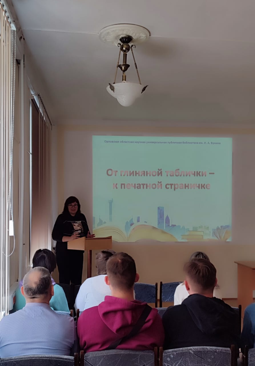 25 апреля 2024 года, в рамках празднования Всемирного дня книги и авторского права, сотрудниками библиотеки был проведен библиокруиз «От глиняной таблички – к печатной страничке». Участниками мероприятия стали подопечные БУ ОО Комплексного центра социального обслуживания населения Заводского района города Орла.