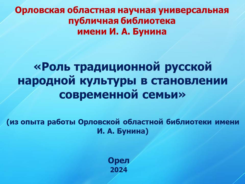 Сотрудники Орловской областной научной универсальной публичной библиотеки им. И. А. Бунина – Марина Валентиновна Торопова и Елена Николаевна Овчинникова представили доклад на тему «Роль традиционной русской народной культуры в становлении современной семьи (из опыта работы Орловской областной библиотеки им. И. А. Бунина)» в рамках секции «Работа библиотек в Год семьи: формирование традиционных морально-этических ценностей».