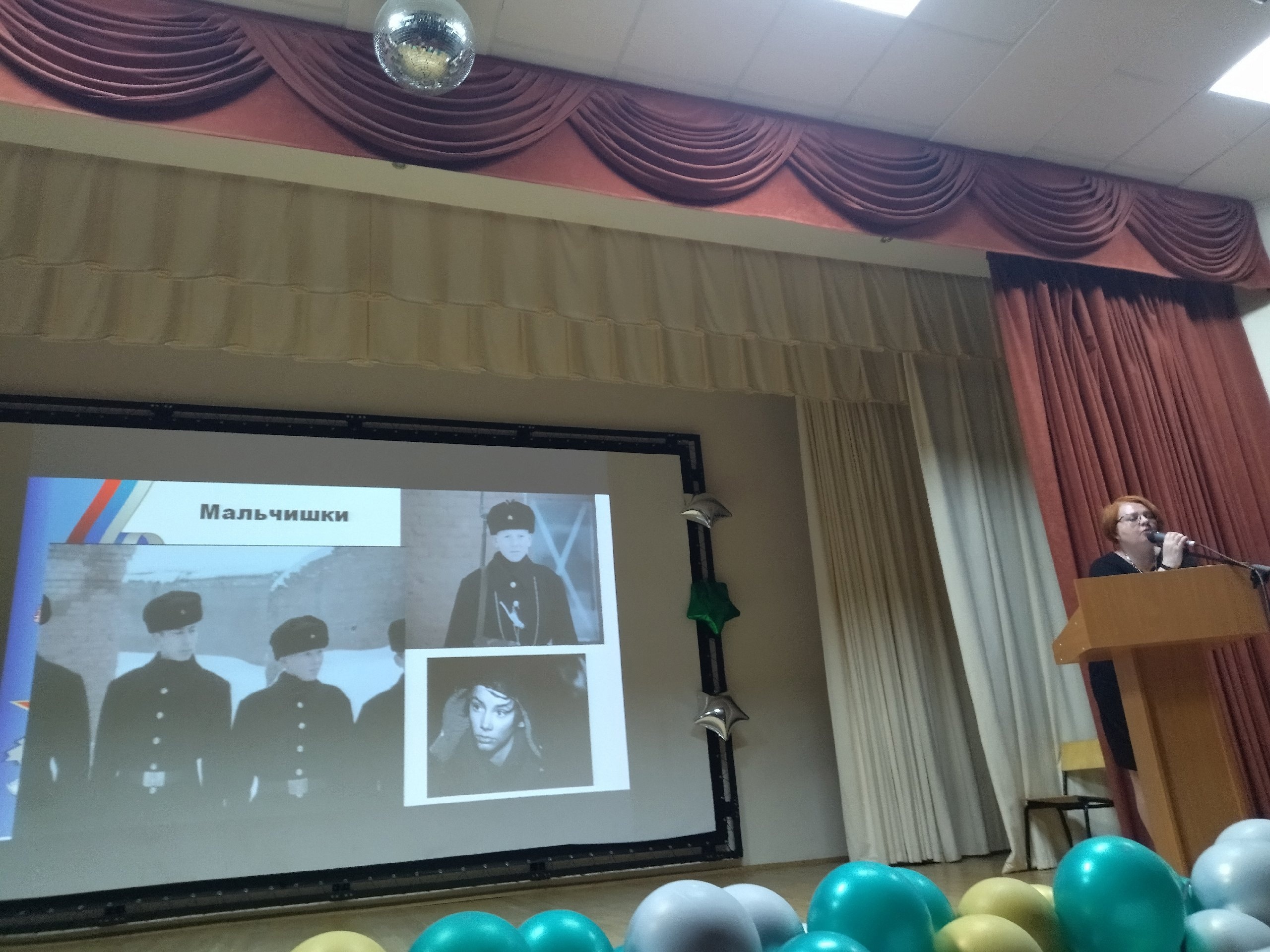 Ученики школы №10 слушают рассказ сотрудницы областной библиотеки о военных фильмах прошлых лет