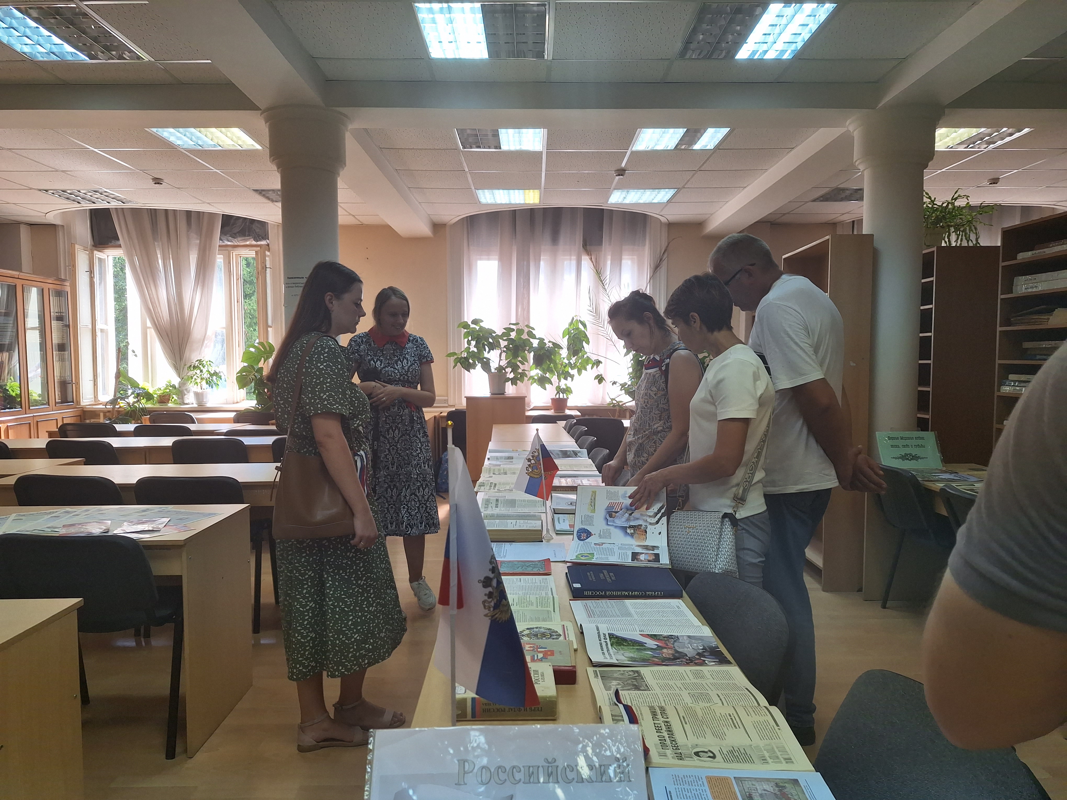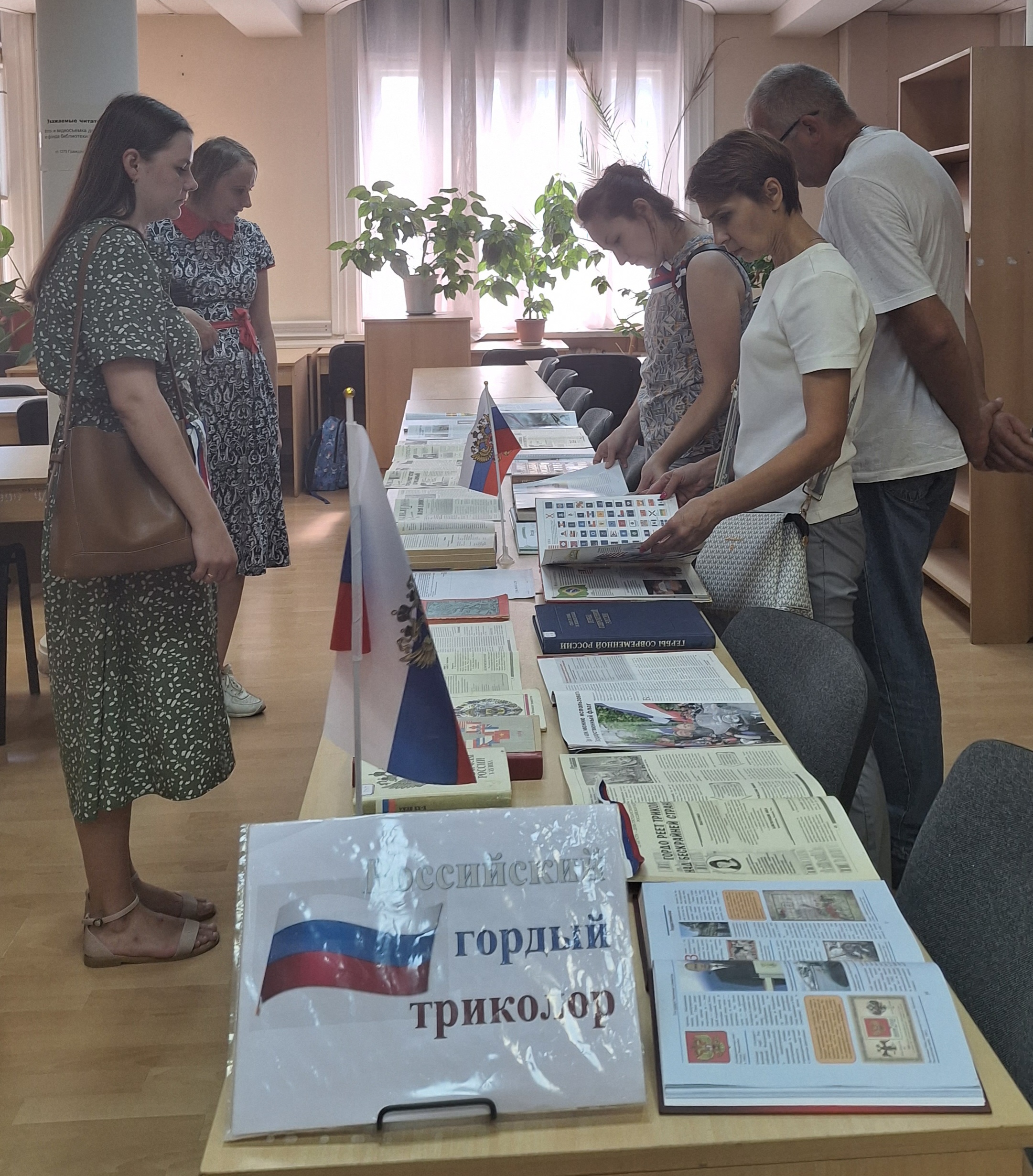 22 августа 2024 года в зале периодики библиотеки состоялся обзор выставки «Российский гордый триколор», открытой ко Дню Государственного флага Российской Федерации.