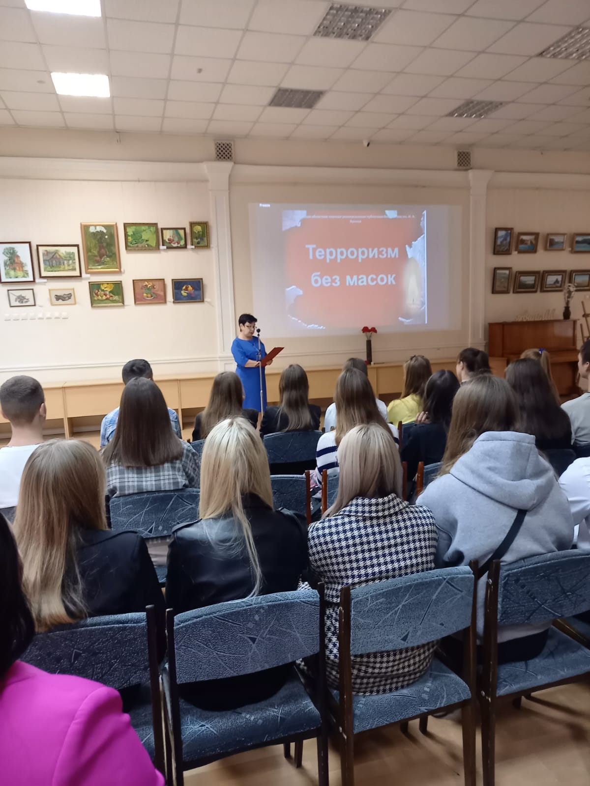 22 сентября 2024 года сотрудники отдела основного книгохранения провели информационный час «Терроризм без масок» для студентов юридического института МВД им. В. В. Лукьянова.