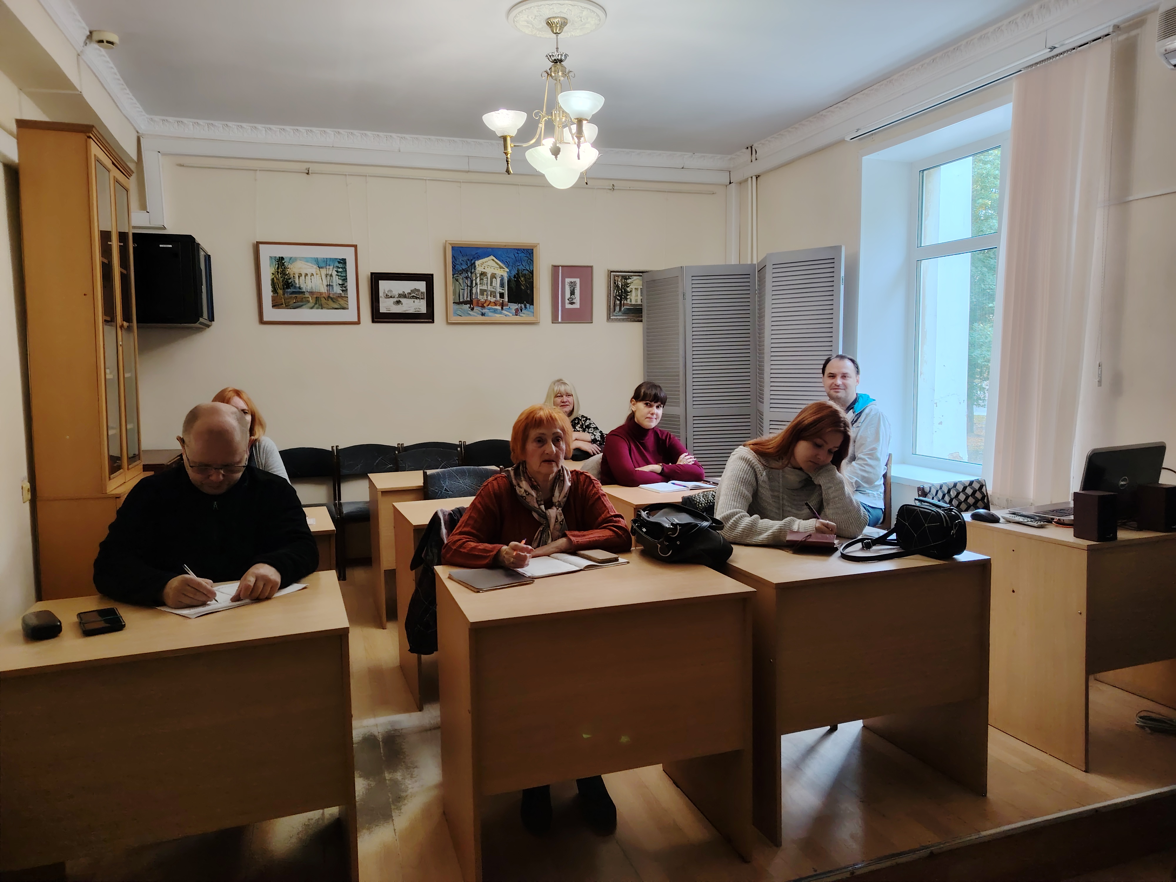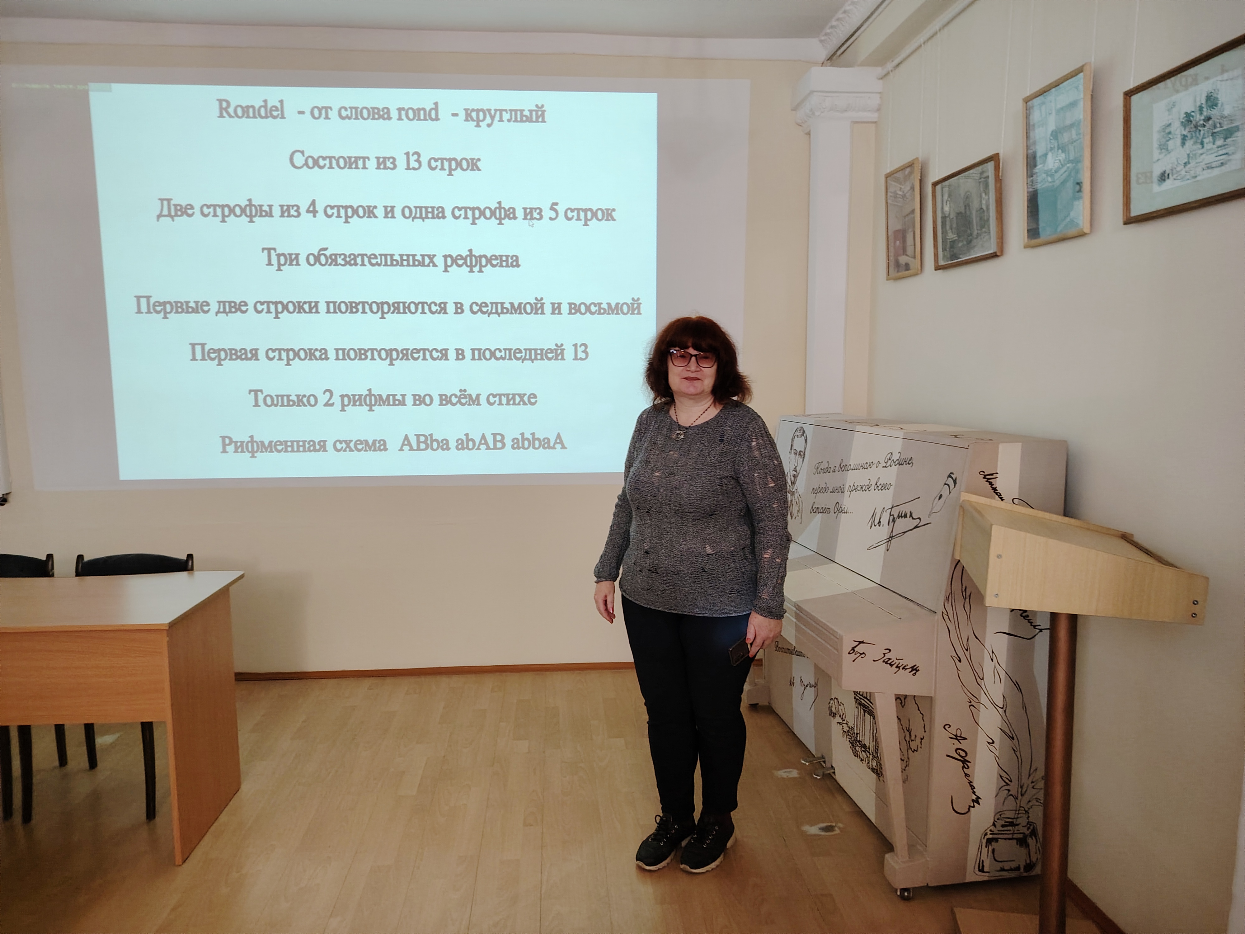 13 октября 2024 года в библиотеке прошло очередное занятие в рамках реализации образовательного проекта «НеЛицей» творческого объединения «Брусчатка». Тема занятия: «Поэзия. Интенсив по твердым поэтическим формам. Рондель».