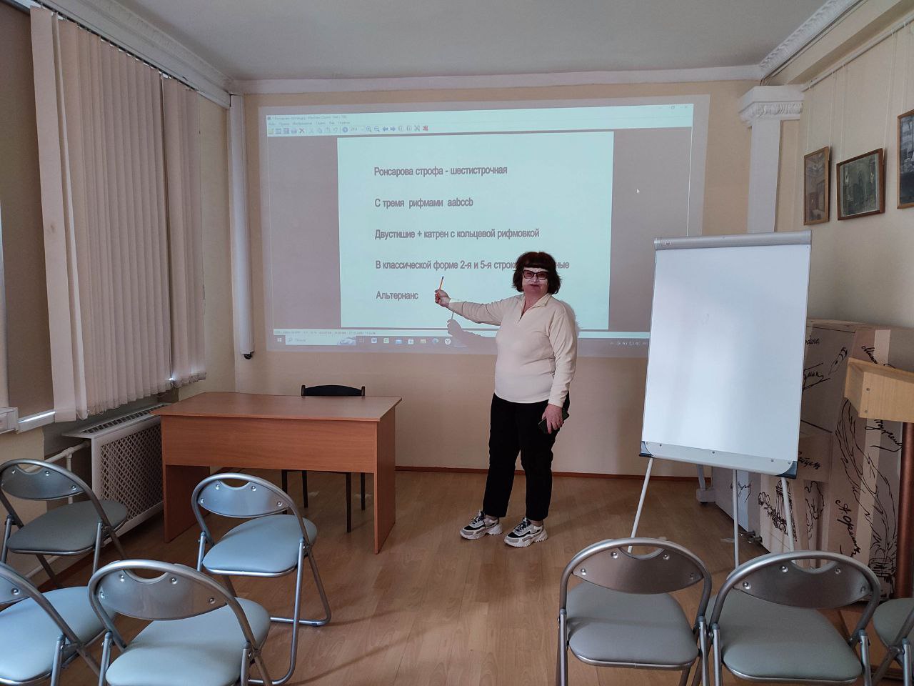 27 октября 2024 года в библиотеке состоялось занятие в рамках реализации образовательного проекта «НеЛицей» творческого объединения «Брусчатка». Тема занятия: «Поэзия. Интенсив по твёрдым поэтическим формам. Ронсарова строфа».