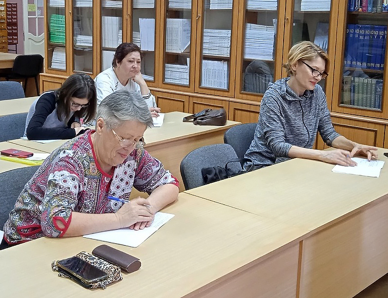 Слушатели изучили сложные темы, которые часто вызывают затруднения при написании текстов. Затем они выполнили небольшой диктант, основанный на произведениях автора «Тотального диктанта – 2025» Марины Москвиной. Это позволило им не только проверить свои знания, но и привыкнуть к стилю писательницы, что может быть полезно при написании собственных текстов.