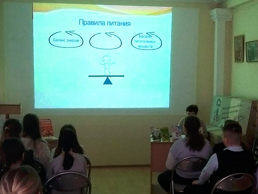 Сотрудниками отдела производственной литературы была продемонстрирована электронная презентация книг о правилах рационального питания. Для молодежи была организована книжная выставка «Формула здорового питания». Школьники познакомились с литературой и охотно проанализировали свои пищевые привычки, ответив на вопросы анкеты «Едим ли мы то, что следует есть?».