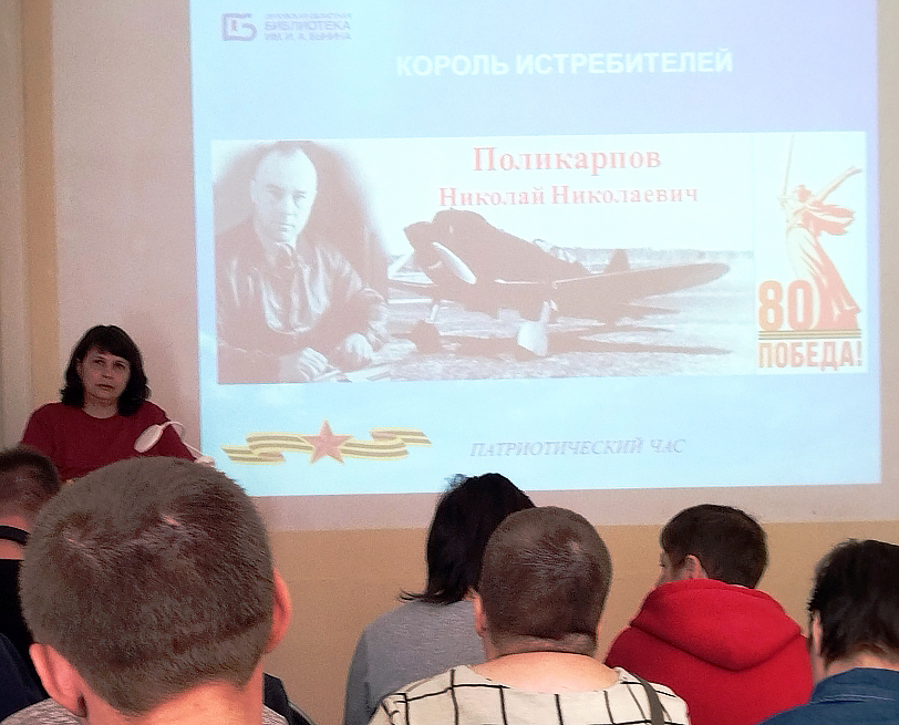 30 апреля 2025 года в Орловской областной библиотеке им. И. А. Бунина к 80-летию Победы в Великой Отечественной войне был проведен патриотический час: Николай Николаевич Поликарпов – «Король истребителей».