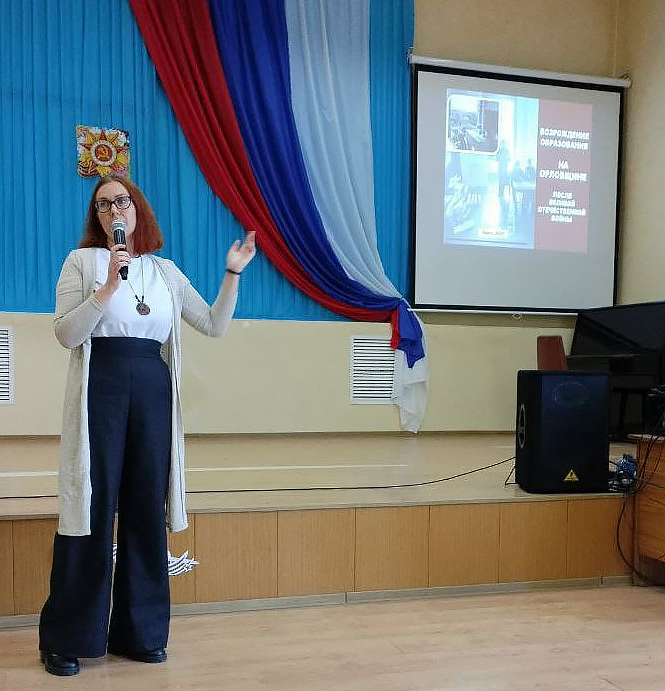 Затем выступила главный библиотекарь Орловской областной библиотеки им. И. А. Бунина Наталья Викторовна Ставцева. Она рассказала ребятам о том, в каком состоянии находился город Орел и Орловская область в целом после 22 месяцев оккупации и какие меры и зачем предпринимались, чтобы в скорейшие сроки восстановить учебный, образовательный процесс для школьников и студентов после освобождения.