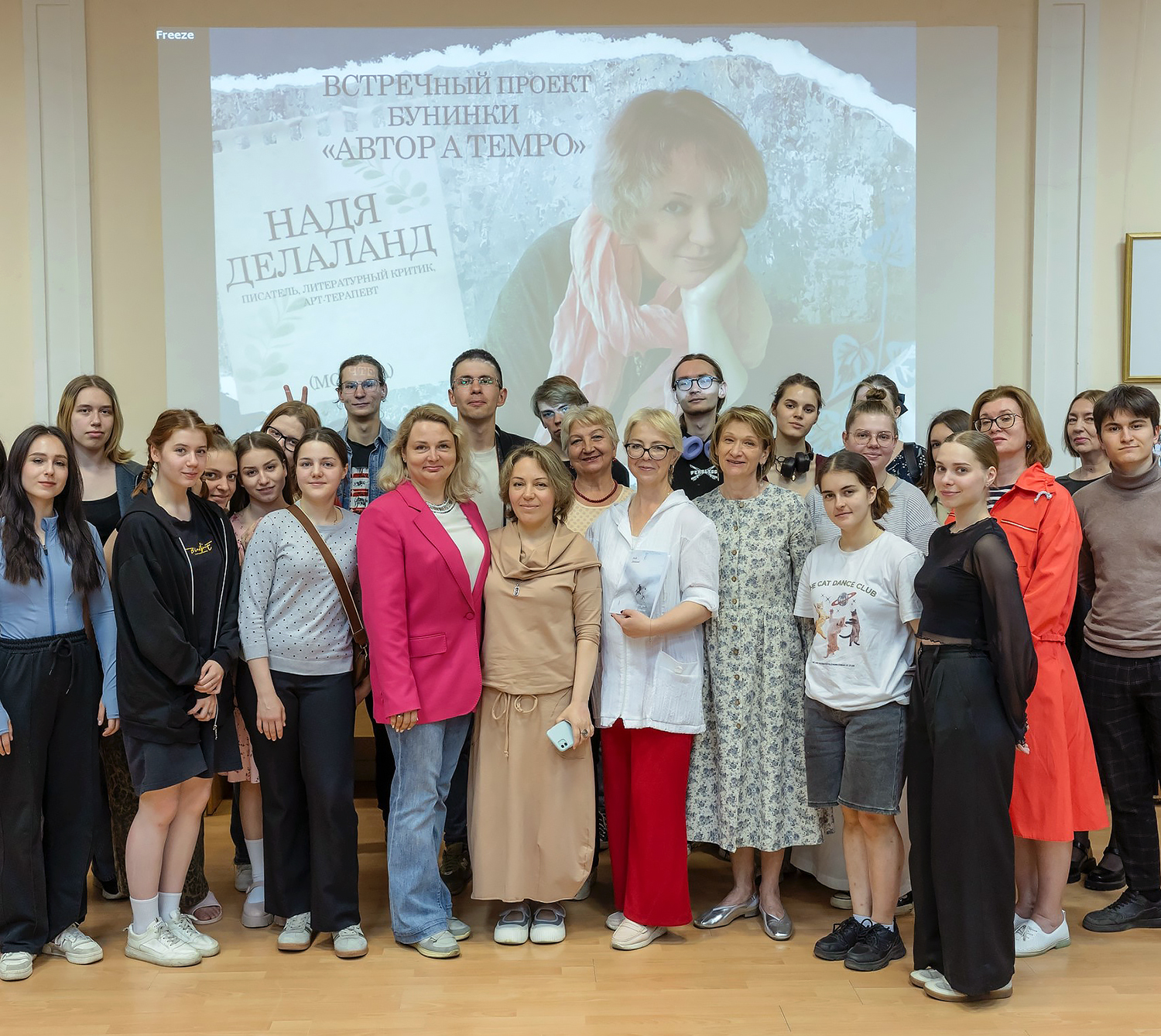 30 мая 2025 года состоялась очередная встреча в рамках проекта «Автор a tempo» Центра чтения Бунинки и Академии изящной словесности «Орлея». В гостях у библиотеки побывала Надя Делаланд (г. Москва) – писатель, член Союза Российских писателей, литературный критик, кандидат филологических наук, практикующий психолог, арт-терапевт, генеральный директор центра арт-терапии и интермодальной терапии искусствами «Делаландия».