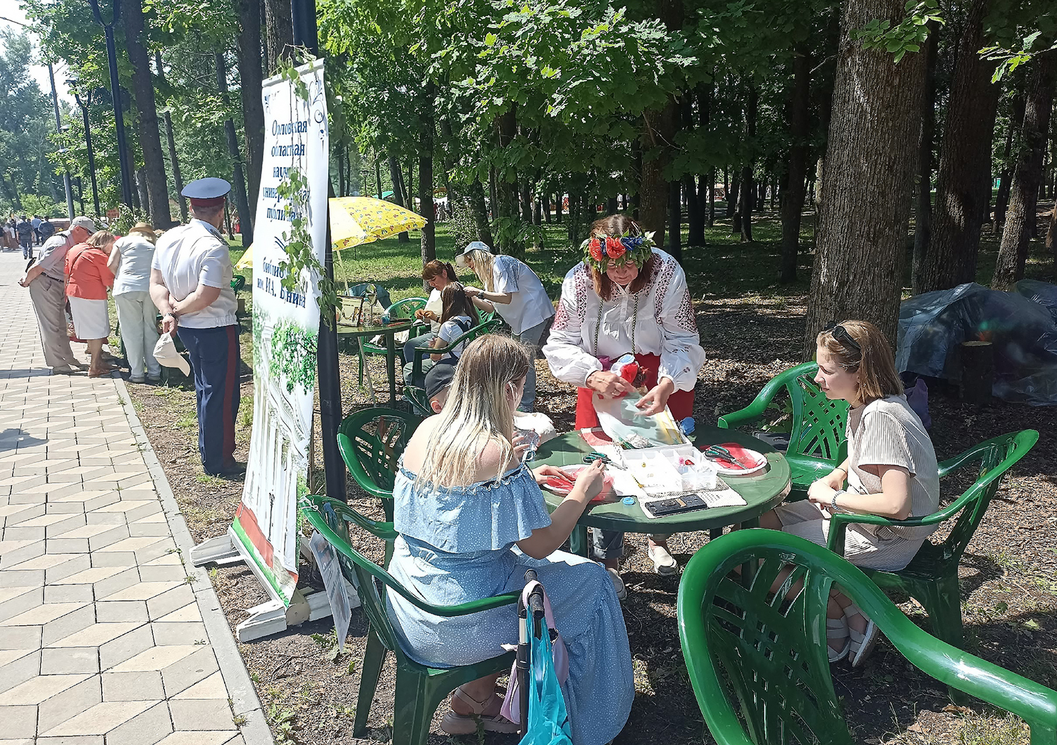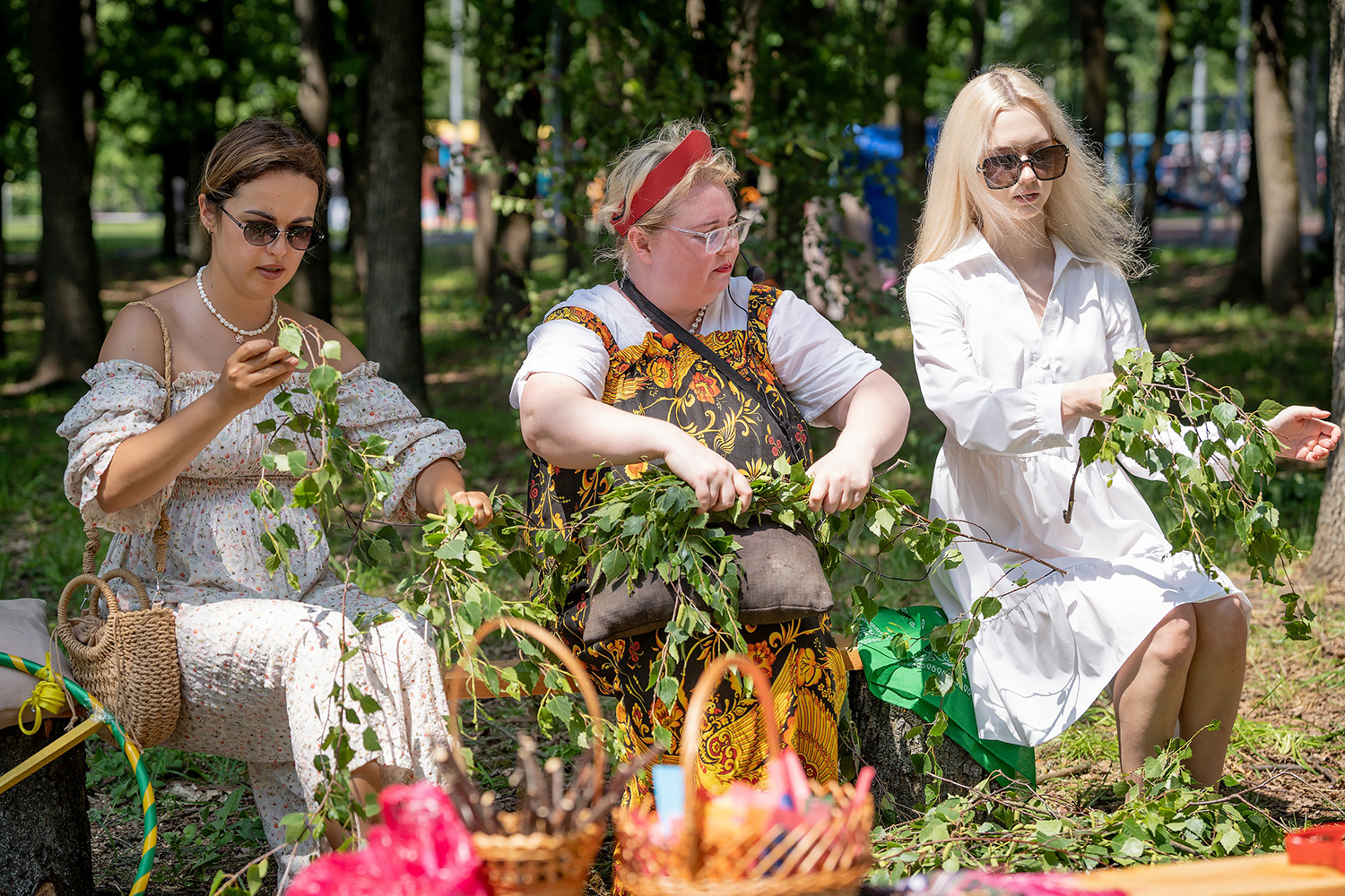 Кроме того, в рамках праздника прошел мастер-класс по плетению венков из березовых веток. Береза на Троицу считается священным деревом. Она раньше остальных деревьев украшает себя после зимы и все троицкие обряды совершались у этого дерева или вместе с ним. По преданиям это дерево наделено большой жизненной силой, а березовые венки играли огромную роль в русской народной культуре.
