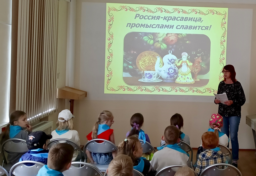25 июня 2025 года в библиотеке состоялась познавательная тематическая встреча «Россия-красавица промыслами славится» для воспитанников пришкольного лагеря «Dragon family».