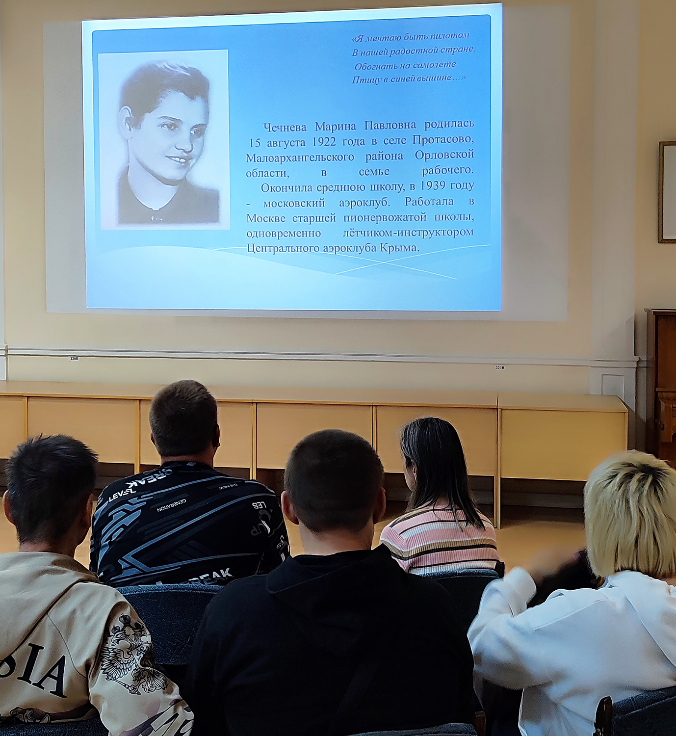На мероприятии были представлены фрагменты из книг М. П. Чечневой «Небо остаётся нашим», «Подруги мои боевые», содержащие воспоминания о фронтовых буднях, о боевых подругах-летчицах.