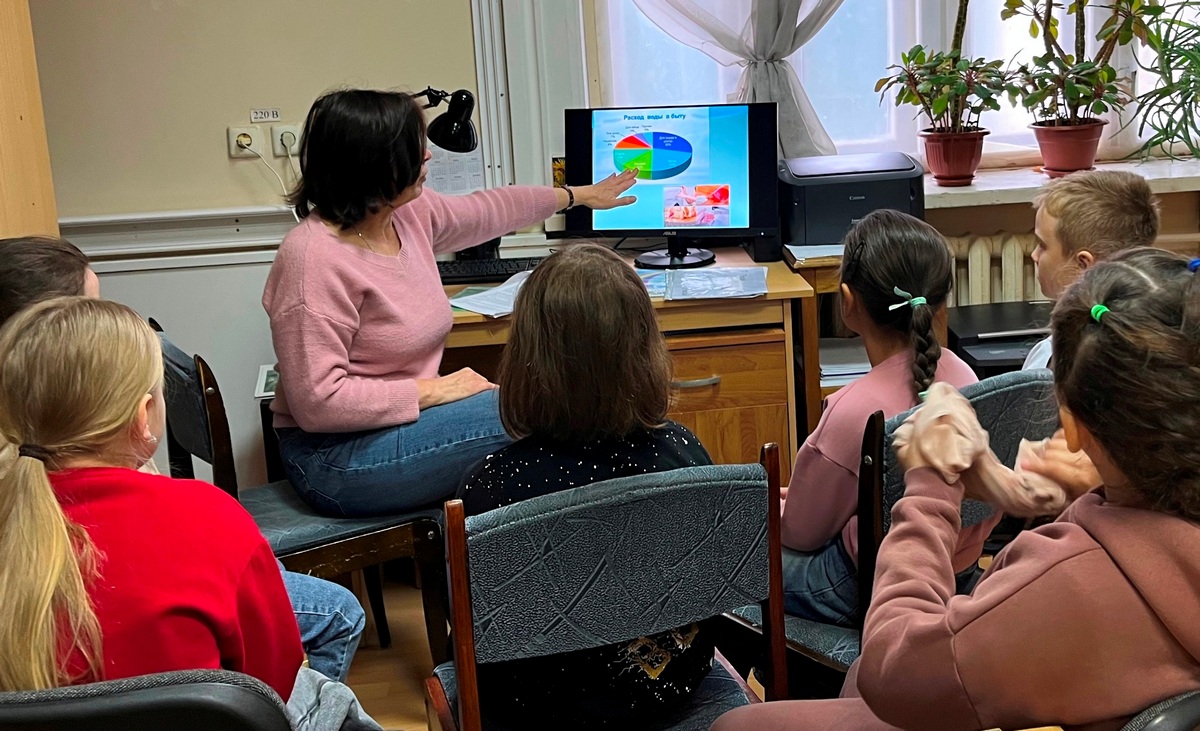 Первоклассники посмотрели мультфильм о круговороте воды в природе и познакомились с литературой из фонда отдела производственной литературы. Особый интерес у ребят вызвала книга «Приключения Капельки в городе Орле», изданная по инициативе МПХ ВКХ «Орелводоканал» г. Орла.