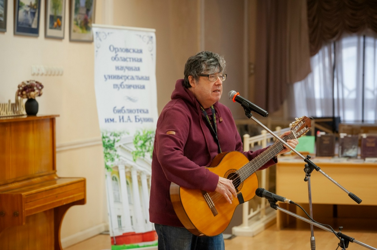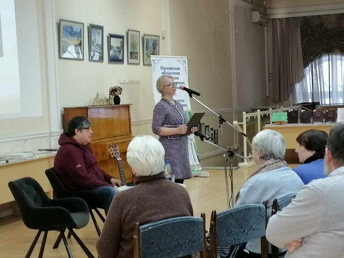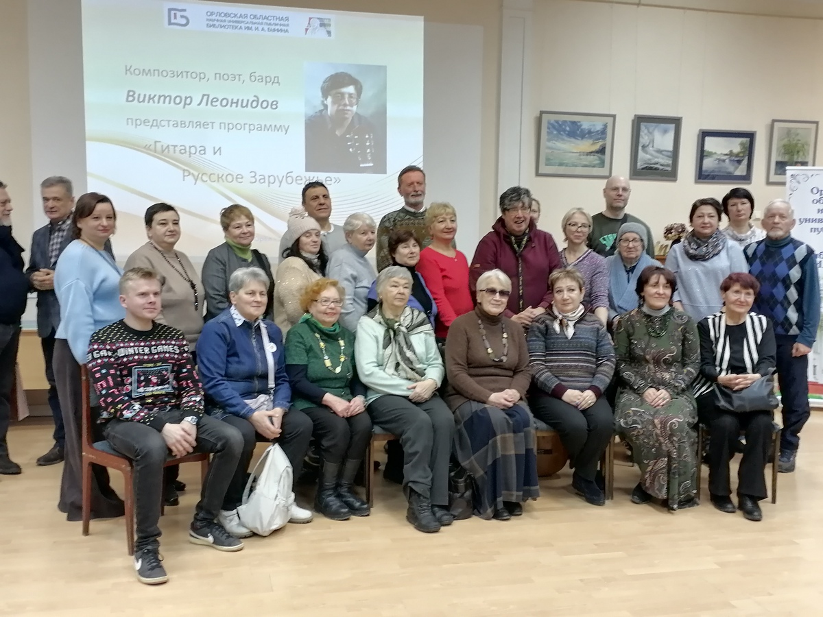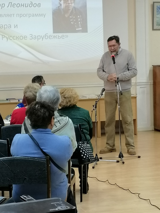 Встречу открыла Н. А. Меркурьева– кандидат филологических наук, доцент, руководитель Центра чтения Орловской областной научной универсальной публичной библиотеки им. И. А. Бунина. Представляя собравшимся Виктора Владимировича Леонидова, она затронула тему Русского исхода, которая близка Виктору Леонидову, так как он является собирателем русских эмигрантских архивов. Виктор Владимирович – автор-составитель шести книг поэтов русского зарубежья, среди них его любимый поэт Николай Туроверов, более 500 статей, опубликованных им в различных газетах, журналах, энциклопедиях и научных сборниках, в основном посвященных наследию российского изгнания ХХ века.