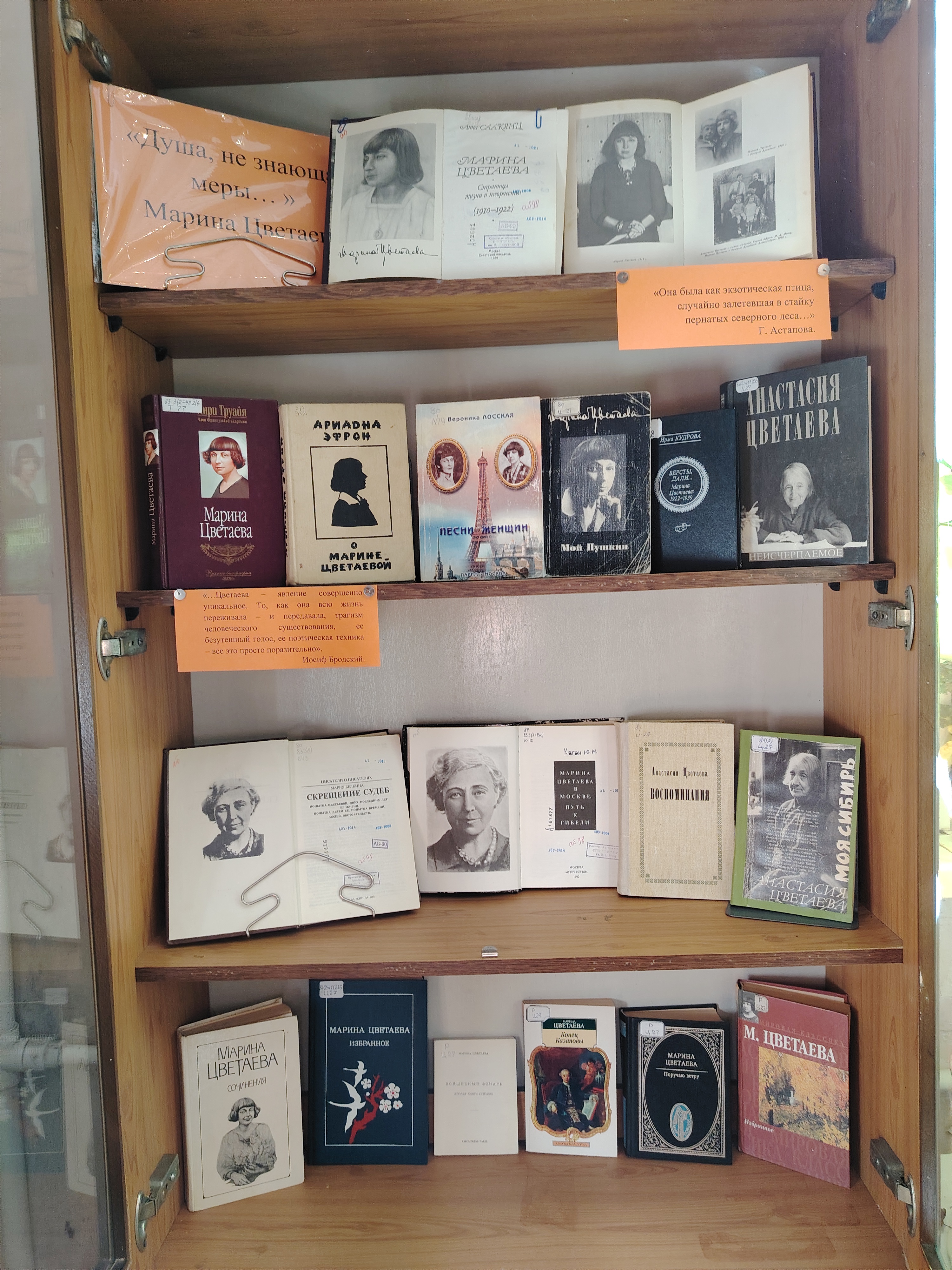 С 26 сентября по 15 октября 2024 года в отделе абонемента образовательных услуг Орловской областной библиотеки им. И. А. Бунина работает книжная выставка «Душа, не знающая меры…», посвященная Марине Ивановне Цветаевой.