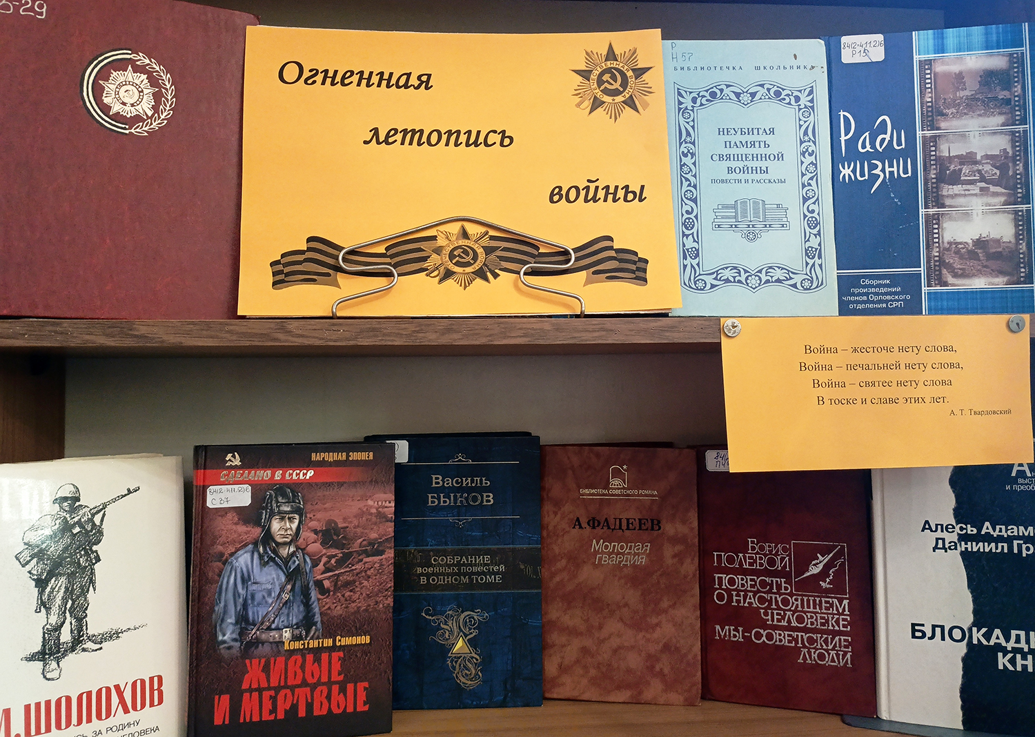 С 5 по 12 мая 2025 года в отделе абонемента образовательных услуг Орловской областной библиотеки им. И. А. Бунина работает выставка «Огненная летопись войны», посвященная Дню Победы в Великой Отечественной войне. Это один из дней воинской славы России. Указом Президента Российской Федерации 2025 год объявлен Годом Защитника Отечества и Годом 80-летия Победы в Великой Отечественной войне. Этот год – дань уважения к ратному подвигу всех, кто сражался за Родину в разные исторические эпохи, дань памяти героям Великой Отечественной войны.