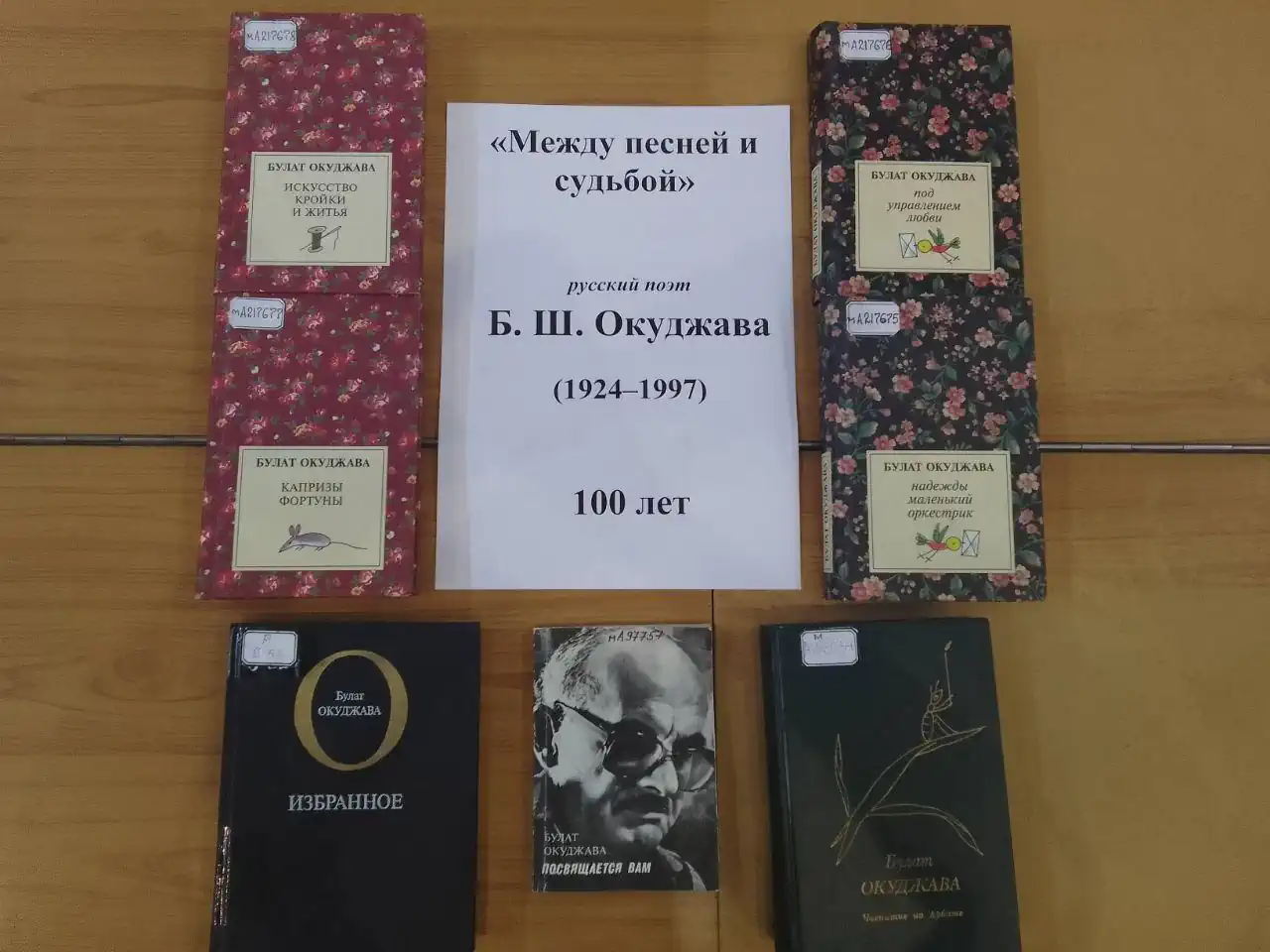 С 30 апреля по 31 мая 2024 года в читальном зале Орловской областной библиотеки им. И. А. Бунина работает выставка «Между песней и судьбой», посвященная 100-летию со дня рождения Б. Ш. Окуджавы.