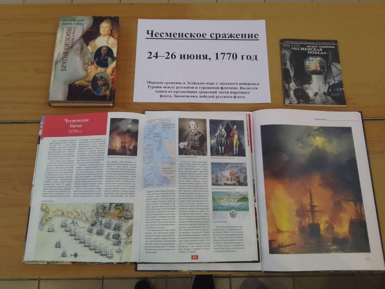 С 30 апреля по 31 мая 2024 года в читальном зале Орловской областной библиотеки им. И. А. Бунина в рамках цикла «Великие сражения в истории России», организована работает выставка литературы «Чесменский бой». Экспозиция напомнит читателям об одной из славных исторических дат: 7 июля 1770 года две эскадры русского флота под командованием адмирала Григория Спиридова и графа Алексея Орлова одержали победу в Чесменской бухте над турецкими силами, вдвое превосходящими силы россиян. Это одна из самых блестящих побед русского флота в военно-морской летописи России.
