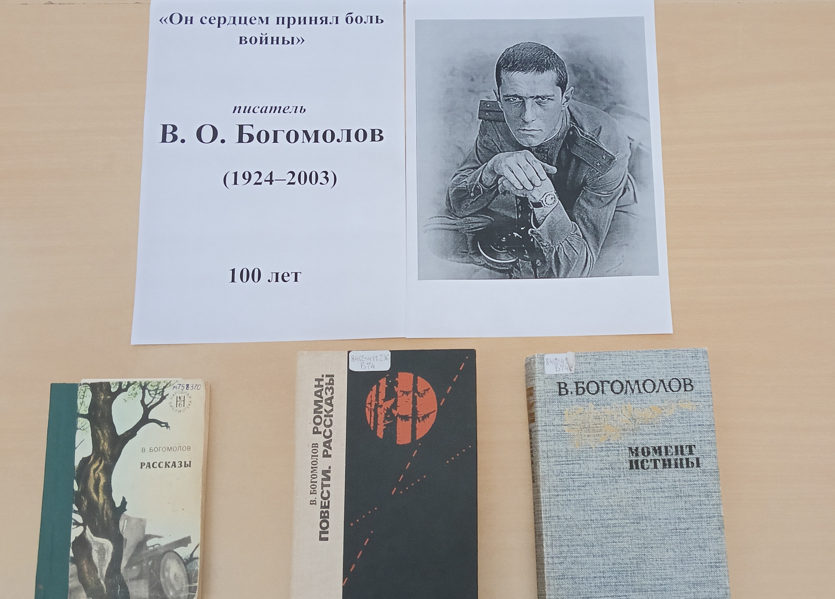 С 1 по 31 июля 2024 года в универсальном читальном зале Орловской областной библиотеки имени И. А. Бунина работает выставка литературы «Он сердцем принял боль войны», приуроченная к 100-летию со дня рождения советского и российского писателя Владимира Осиповича Богомолова (1924–2003).