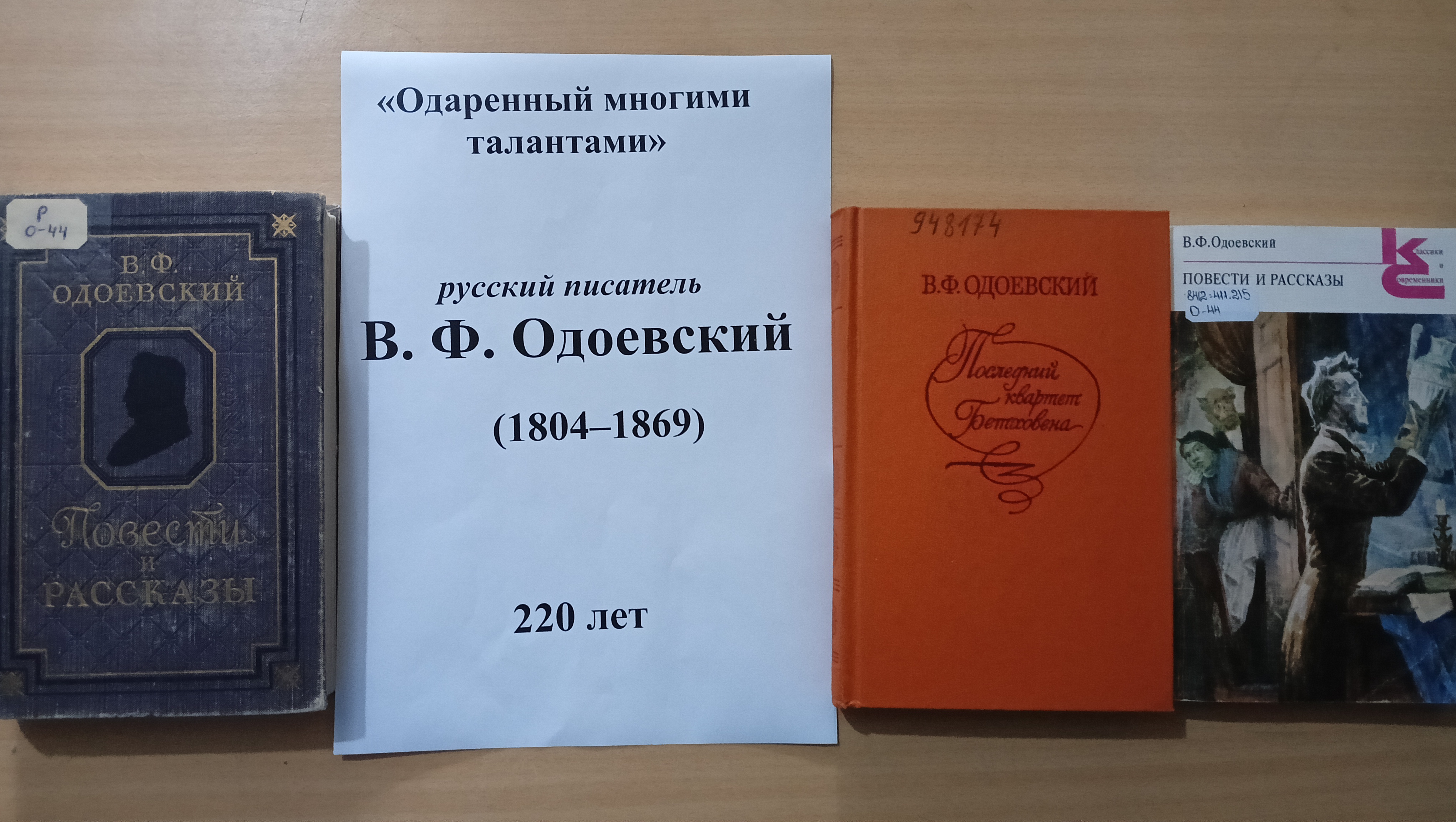 Приглашаем вас посетить книжную выставку, посвящённую жизни и творчеству выдающегося русского писателя, философа и общественного деятеля – Владимира Фёдоровича Одоевского, которая открыта с 1 августа по 2 сентября 2024 года в фойе читального зала Орловской областной научной универсальной публичной библиотеки им. И. А. Бунина. Выставка приурочена к 220-летию со дня рождения драматурга.