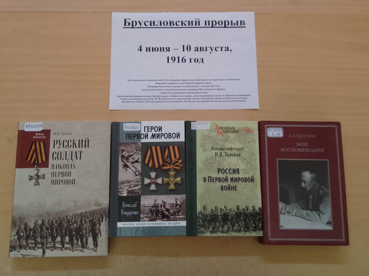 На выставке представлены книги и статьи из периодических изданий, посвященные Брусиловскому прорыву, а также генералу Алексею Алексеевичу Брусилову.