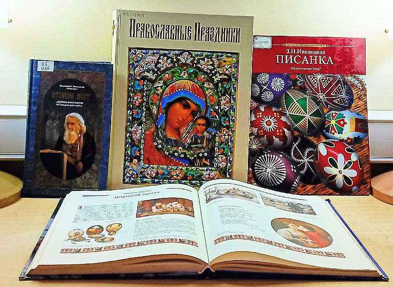 Традиционно на Пасху принято дарить друг другу крашеные яйца, как символ новой жизни и воскресения, которые также являются частью праздничного стола. На выставке литературы представлены иллюстрированные издания, посвященные изготовлению как сувенирных, так и съедобных писанок.