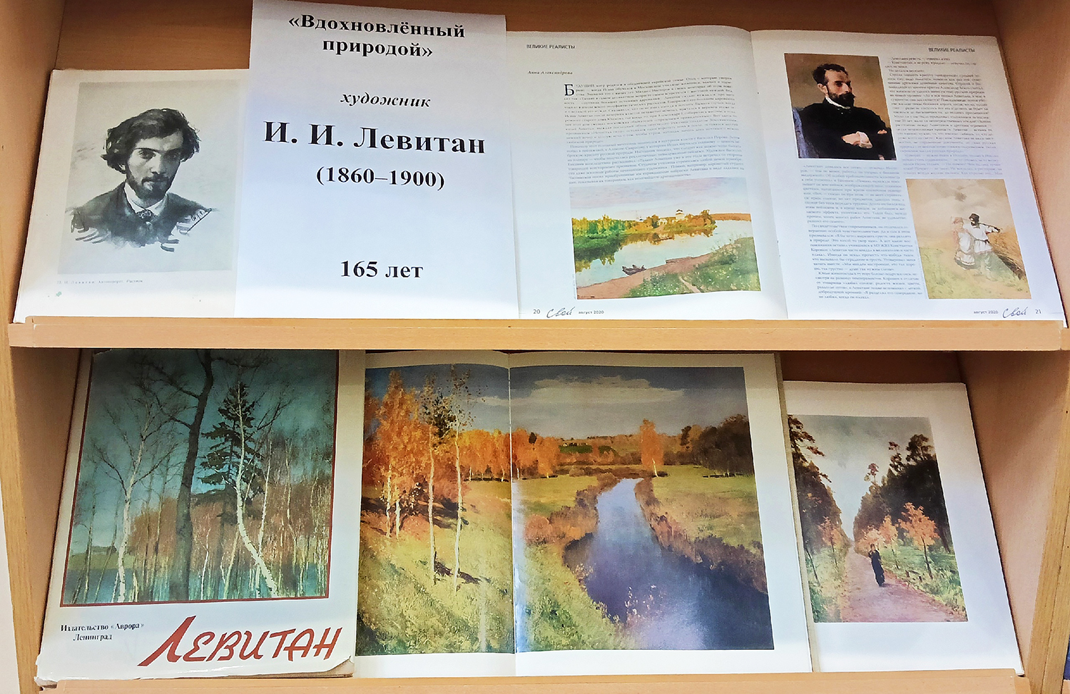 На выставке представлены альбомы с репродукциями картин И. И. Левитана, литература о его жизни и творчестве.