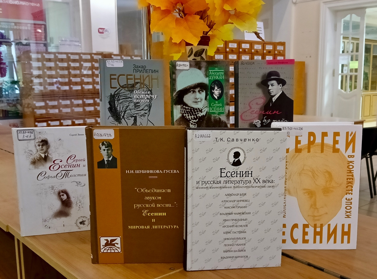 К вершинам поэзии Есенин поднялся из глубин народной жизни. Рязанская земля, была страной его детства. Замечательный фотоальбом «В Россию, в Константиново, к Есенину», который читатели найдут на выставке, познакомит всех любителей творчества великого русского лирика с его родиной, селом Константиново Рязанской области, которое называют поэтическим сердцем России. Особый интерес среди представленных на выставке книг будут иметь воспоминания женщин, в разные годы входивших в окружение Сергея Есенина. Их образы рассыпаны в незабвенной лирике поэта. Также на выставке представлены поэтические произведения, литература о жизни и творчестве, позволяющая более цельно и полно представить судьбу и личность Сергея Есенина.