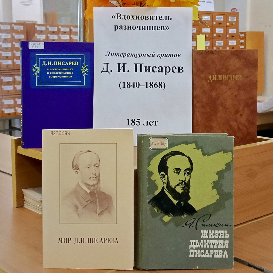 На выставке представлены книги, статьи и другие материалы, связанные с его именем и влиянием на русскую литературу и общественную мысль, включая биографию Дмитрия Писарева, анализ его критических статей и публикаций.
