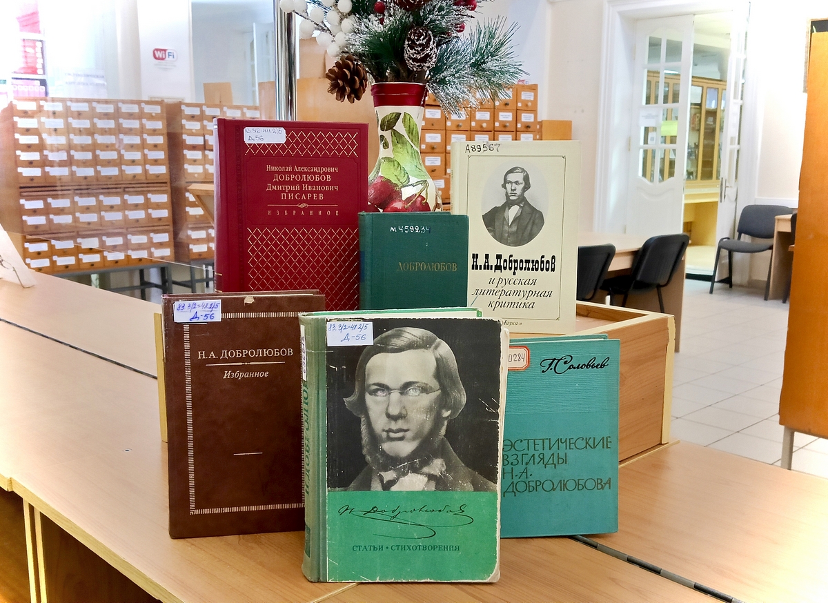 На выставке представлены произведения Добролюбова и литература о нем: Н. А. Добролюбов «Избранные статьи», Н. А. Добролюбов «Эстетика. Литература. Критика», «Н. Добролюбов и русская литературная критика», Г. Г. Елизаветина «Н. А. Добролюбов и литературный процесс его времени» и др.
