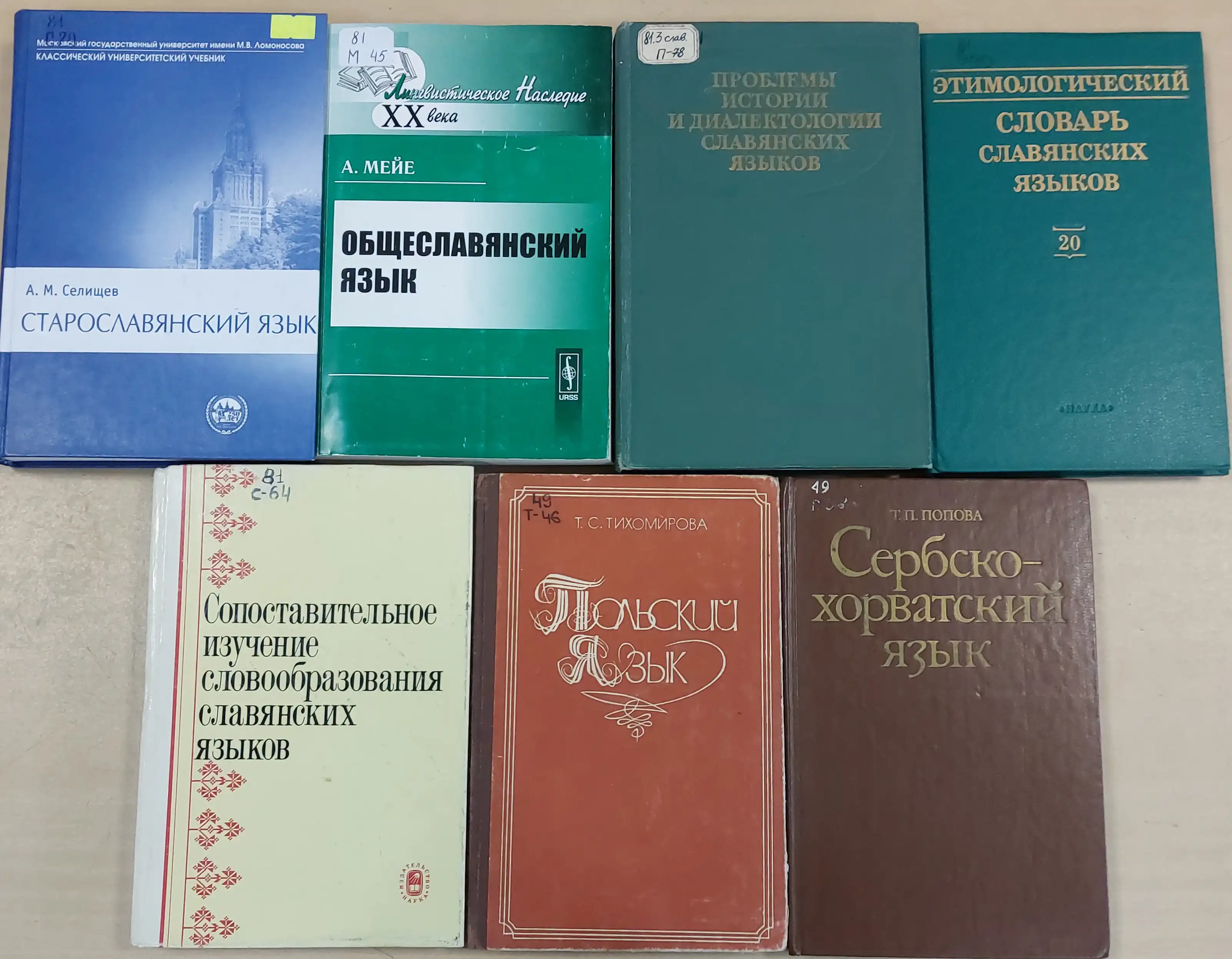 На выставке представлены труды по славянской филологии, учебники, учебные пособия и словари славянских языков.