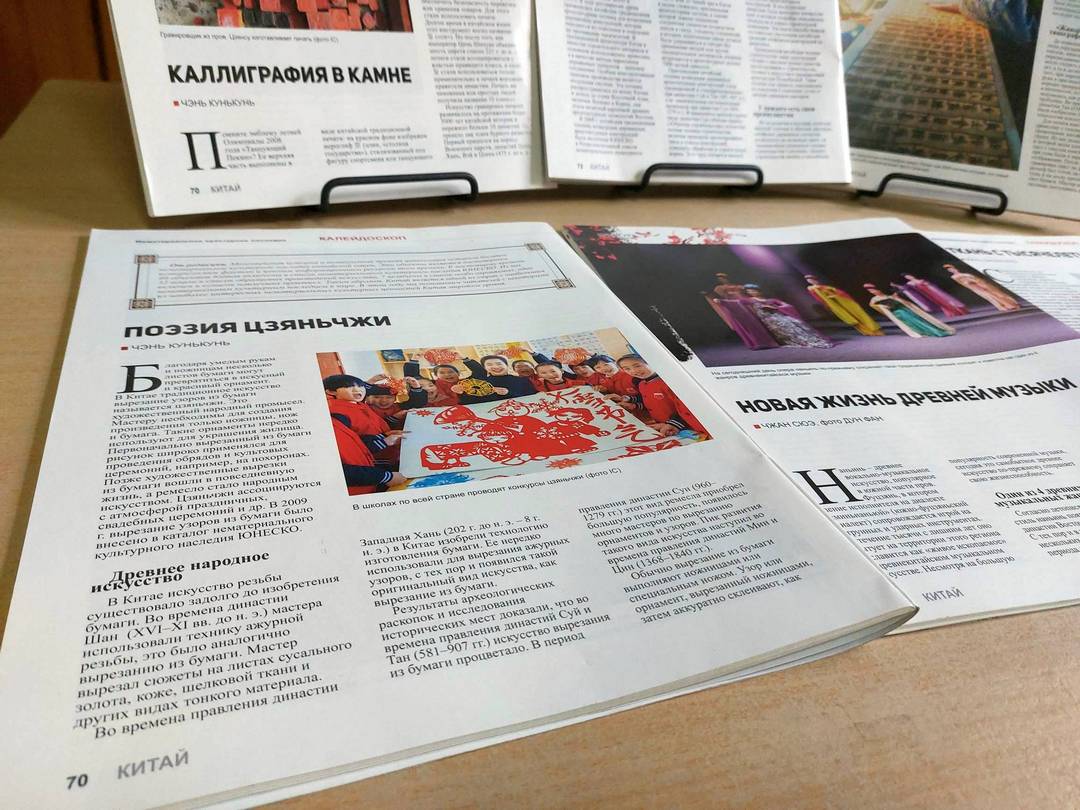 На выставке представлены выпуски журнала «Китай» с разнообразной информацией о нематериальном культурном наследии Китая.