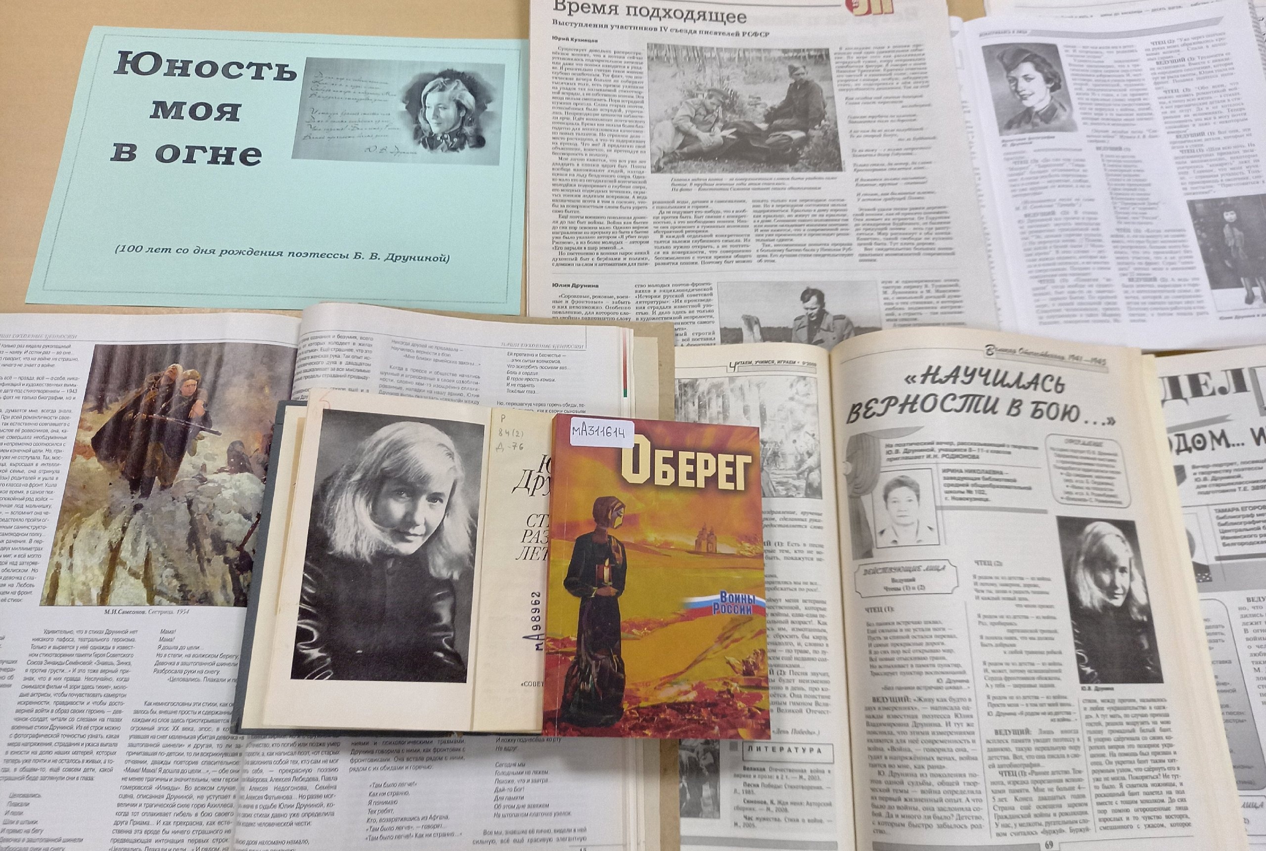 С 6 по 20 мая 2024 года в зале периодики Орловской областной библиотеки им. И. А. Бунина работает выставка «Юность моя в огне», посвященная 100-летию со дня рождения легендарной советской поэтессы Юлии Владимировны Друниной (10 мая 1924 г. – 21 ноября 1991 г.).