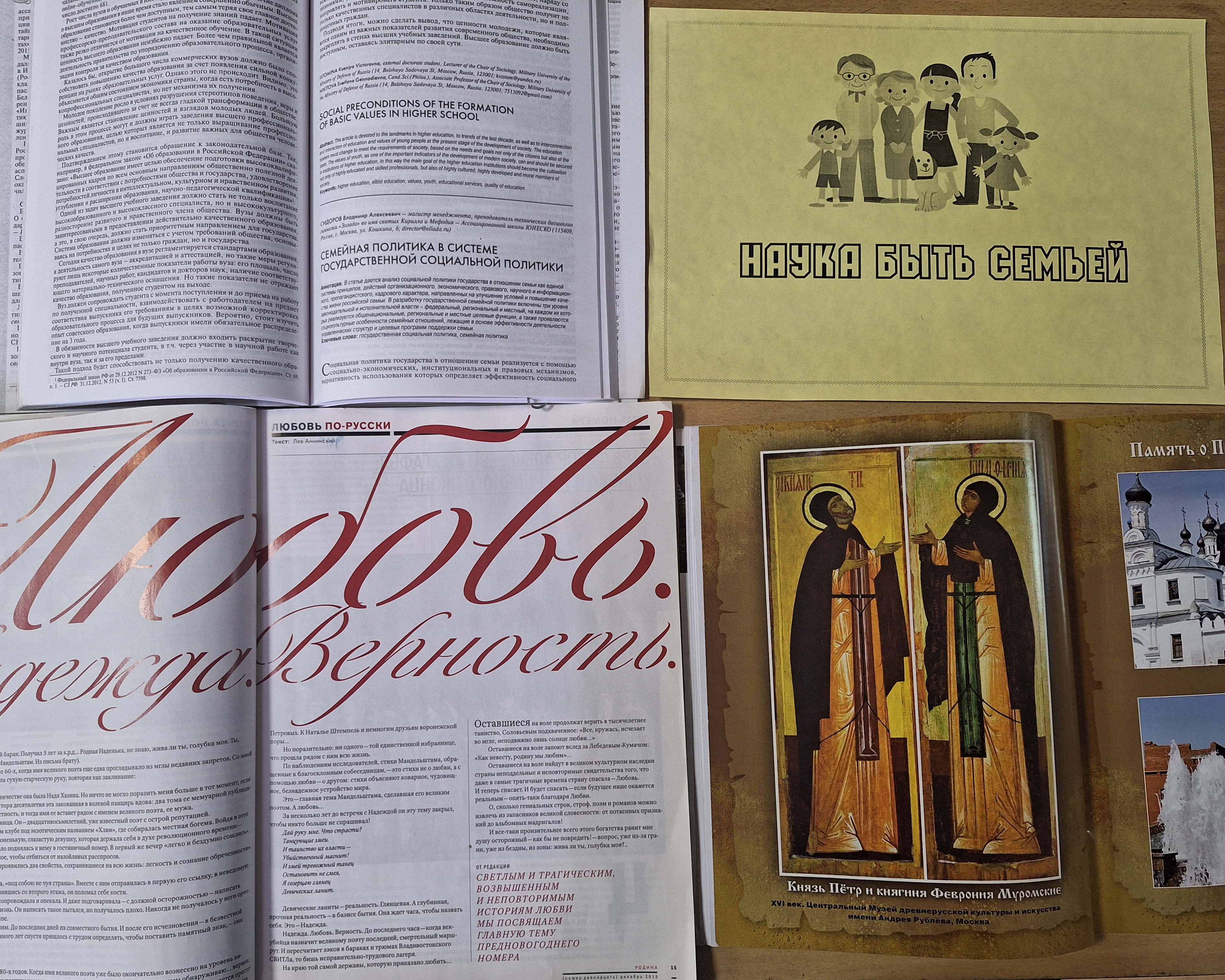 Об уважении к семейным традициям и реликвиям, важности семьи в жизни общества, ее роли в воспитании, в достижении общественной стабильности и прогресса – на эти и другие вопросы отвечают писатели, деятели культуры и эксперты в периодических изданиях: «Власть», «Родина», «Социальная политика и социология» и др.