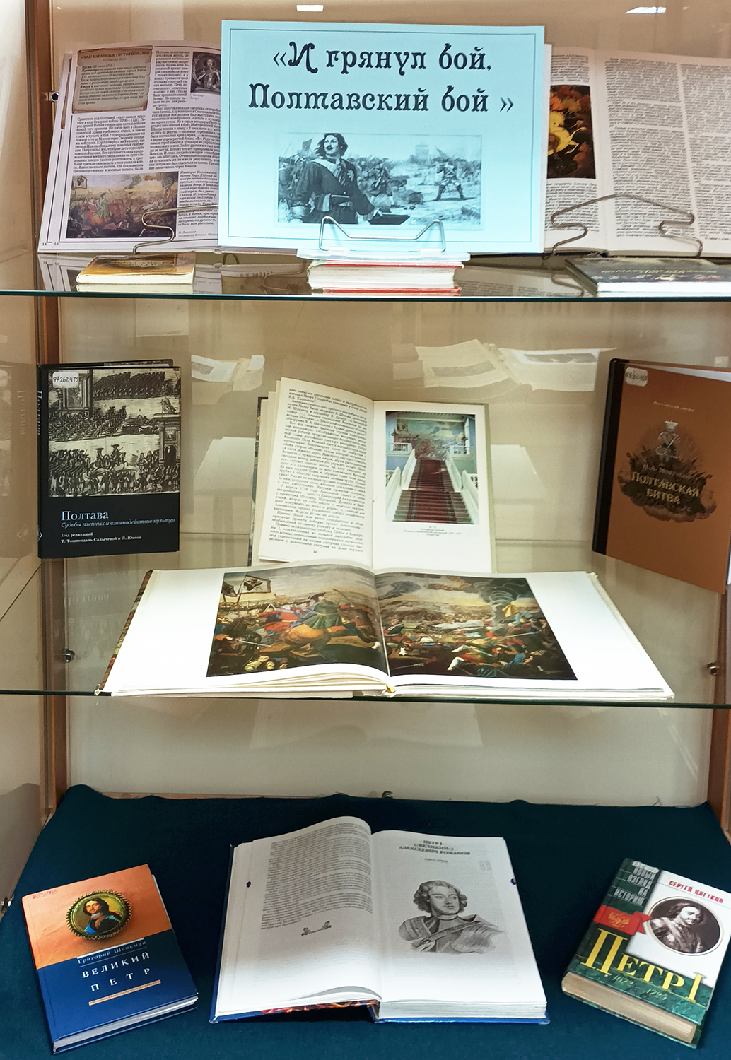 На экспозиции посвящённой этому важнейшему сражению, вы сможете увидеть энциклопедические издания, посвящённые Полтавской битве в целом и Петру I в частности, а также ознакомиться с книгами А. И. Злаина «Полтавская битва», С. Т. Минакова «Полтавское сражение 1709-2009», В. Артамонова «27 июня 1709», в которых во всех подробностях рассматривается ход боя. Среди изобразительных материалов выставки особый интерес вызывает репродукция мозаики великого русского учёного и художника М. В. Ломоносова, посвящённой Полтавской битве.
