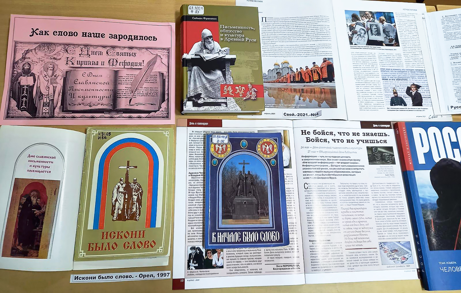 С 20 мая по 3 июня 2025 года в зале периодики Орловской областной библиотеки им. И. А. Бунина работает выставка «Как слово наше зародилось», посвященная празднованию Дня Славянской письменности и культуры, который отмечается 24 мая. В этот день вспоминают святых равноапостольных братьев Кирилла и Мефодия, труды этих великих просветителей стали общим достоянием всех славян, положили основу их нравственному и духовному развитию. В России праздник отмечается ежегодно в соответствии с Постановлением Президиума Верховного Совета РСФСР от 30.01.1991 г.