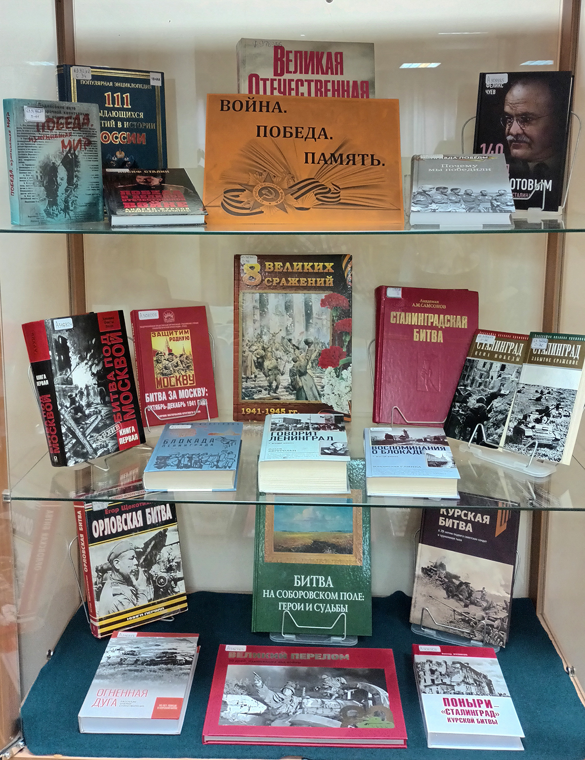 С 7 по 31 мая 2025 года в зале периодических изданий работает выставка «Война. Победа. Память», посвящённая 80-летию Победы в Великой Отечественной войне. Это четвертая выставка из цикла «Вехи Доблести и Славы России». Открывают экспозицию книги о ключевых сражениях Великой Отечественной. Среди них: сборник архивных материалов «Битва под Москвой», «Сталинградская битва» А. М. Самсонова, сборник «Огненная дуга» и другие.