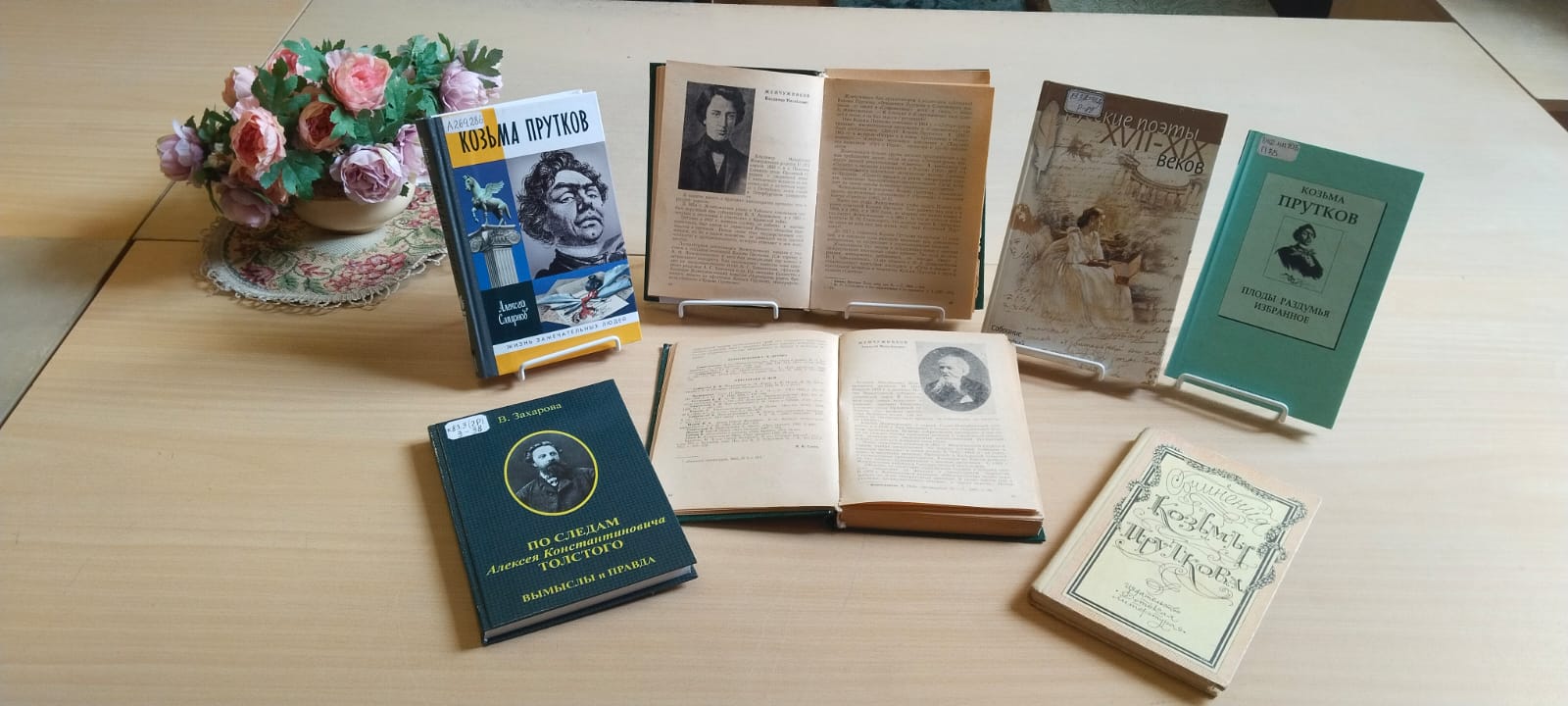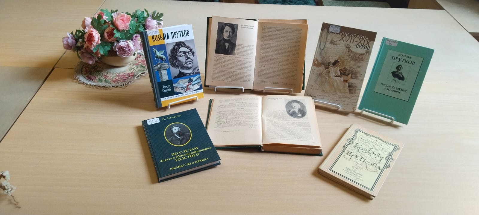 Завершает экспозицию издания о жизни и творчестве Козьмы Петровича Пруткова: Дмитрия Жукова «Козьма Прутков и его друзья» (Москва, 1983), справочно-биографическое издание «Русские поэты XVII – XIX веков: собрание биографий» (Пермь, 2001) – которое включает в себя около 200 биографий русских поэтов XVII – XIX веков, чье наследие стало хрестоматийным, а также сборник Бориса Бухштаба «Русские поэты» (Ленинград, 1970). Книга Николая Кузьмина «Страницы былого» (Москва, 1984) – соединяет в себе талант графика и литератора. В разделе «Книжная графика Н. В. Кузьмина» размещены иллюстрации к книге Пруткова «Плоды раздумья: мысли и афоризмы».