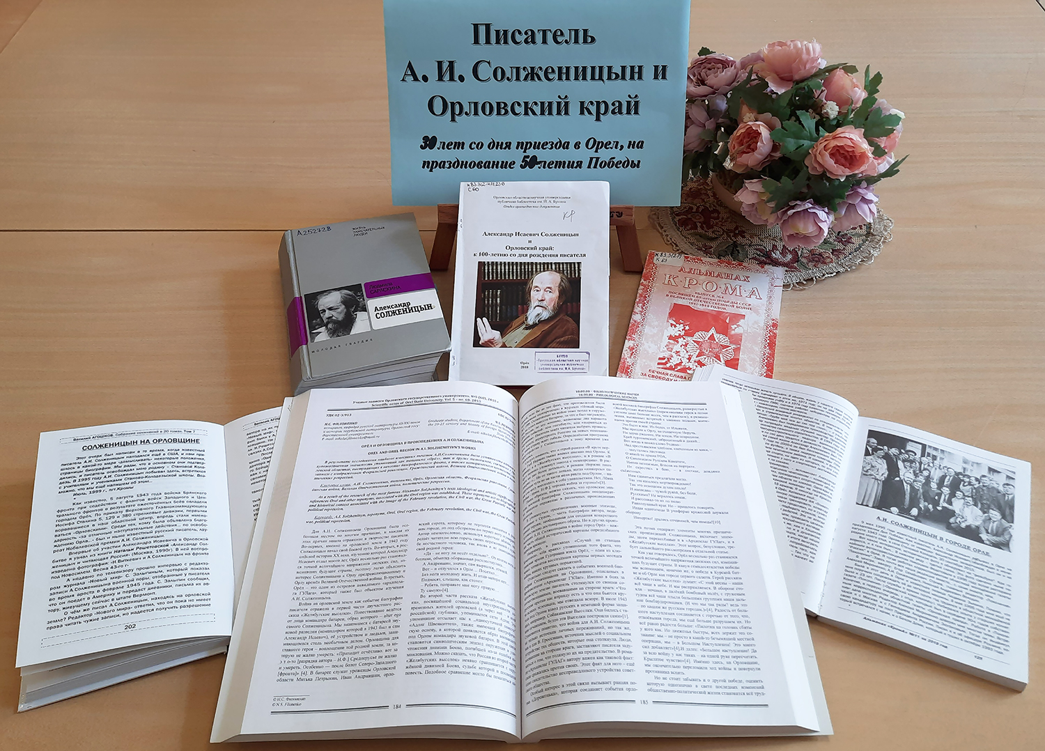 С 1 по 31 мая 2025 года в отделе краеведческих документов Орловской областной библиотеки им. И. А. Бунина работает выставка литературы «Писатель А. И. Солженицын и Орловский край».