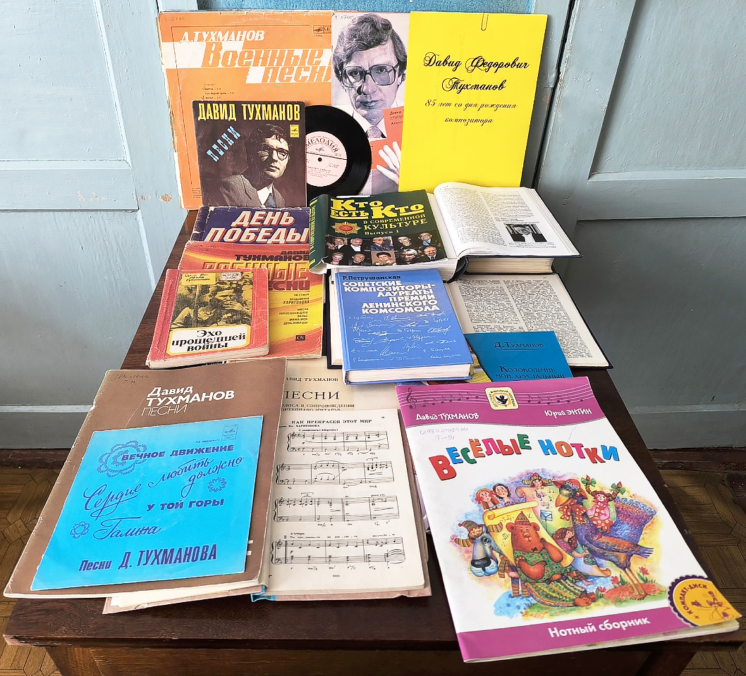 Один из разделов выставки посвящен песне «День Победы». Композитору было бы достаточно написать только одну эту песню, чтобы получить всенародную любовь. Она была написана к 30-летию Победы в Великой Отечественной войне, в 1975 году. В 2025 г. ей исполнилось 50 лет. Нотный сборник «День Победы» и «Военные песни» Д. Тухманова, а также книга А. Луковников «Эхо прошедшей войны», где собраны интересные факты из «биографий» популярных послевоенных песен, среди которых и «День Победы», иллюстрирует этот раздел.