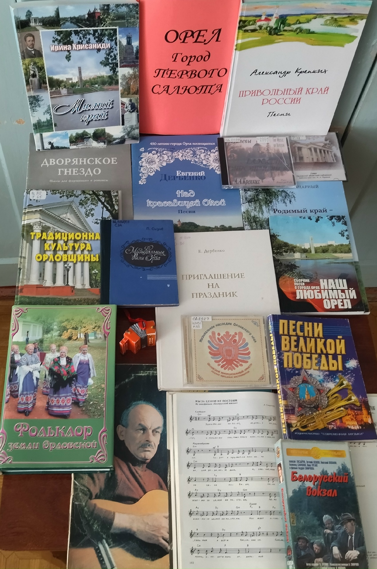 Экспозицию дополняют грамзаписи и видеокассеты с песнями, где упоминается город Орел, CD-диски, среди которых «Музыкальное наследие Орловского края». Музыкально-нотная литература, представленная на выставке, пользуется популярностью среди читателей.